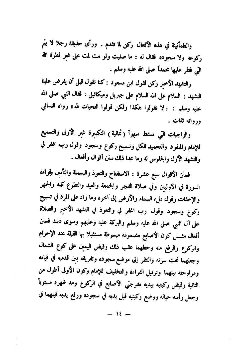 فسنن الأقوال سبع عشرة: الاستفتاح والتعوذ والبسملة والتأمين وقراءة السورة في الأوليين وفي صلاة الفجر والجمعة والعيد والتطوع كله والجهر والإخفات وقول "ملء السماء والأرض إلى آخره"، وما زاد على المرة في تسبيح ركوع وسجود وقول "رب اغفر لي" والتعوذ في التشهد الأخير والصلاة على آل النبي صلى الله عليه وسلم والبركة عليه وعليهم. وسوى ذلك فسنن أفعال مثل كون الأصابع مضمومة مبسوطة مستقبلا بها القبلة عند الإحرام والركوع والرفع منه، وحطهما عقب ذلك، وقبض اليمين على كوع الشمال وجعلهما تحت سرته، والنظر إلى موضع سجوده، وتفريقه بين قدميه، في قيامه ومراوحته بينهما، وترتيل القراءة، والتخفيف للإمام، وكون الأولى أطول من الثانية، وقبض ركبتيه بيديه مفرجتي الأصابع في الركوع، ومد ظهره مستويا، وجعل رأسه حياله، ووضع ركبتيه قبل يديه في سجوده، ورفع يديه قبلهما في