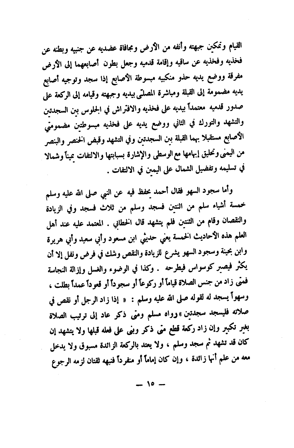 وأما سجود السهو فقال أحمد: يحفظ فيه عن النبي صلى الله عليه وسلم خمسة أشياء: سلم من اثنتين فسجد، وسلم من ثلاث فسجد، وفي الزيادة والنقصان، وقام من الثنتين فلم يتشهد. قال الخطابي: المعتمد عليه عند أهل العلم هذه الأحاديث الخمسة يعني حديثي ابن مسعود وأبي سعيد وأبي هريرة وابن بحينة. وسجود السهو يشرع للزيادة والنقص وشك في فرض ونفل، إلا أن يكثر فيصير كوسواس فيطرحه. وكذا في الوضوء والغسل وإزالة النجاسة، فمتى زاد من جنس الصلاة قياما أو ركوعا أو سجودا أو قعودا عمدا بطلت، وسهوا يسجد له لقوله صلى الله عليه وسلم: "إذا زاد الرجل أو نقص في صلاته فليسجد سجدتين" 1 رواه مسلم. ومتى ذكر عاد إلى ترتيب الصلاة بغير تكبير، وإن زاد ركعة قطع متى ذكر، وبنى على فعله قبلها، ولا يتشهد إن كان قد تشهد، ثم سجد وسلم. ولا يعتد بالركعة الزائدة مسبوق، ولا يدخل معه من علم أنها زائدة، وإن كان إماما أو منفردا فنبهه ثقتان لزمه الرجوع