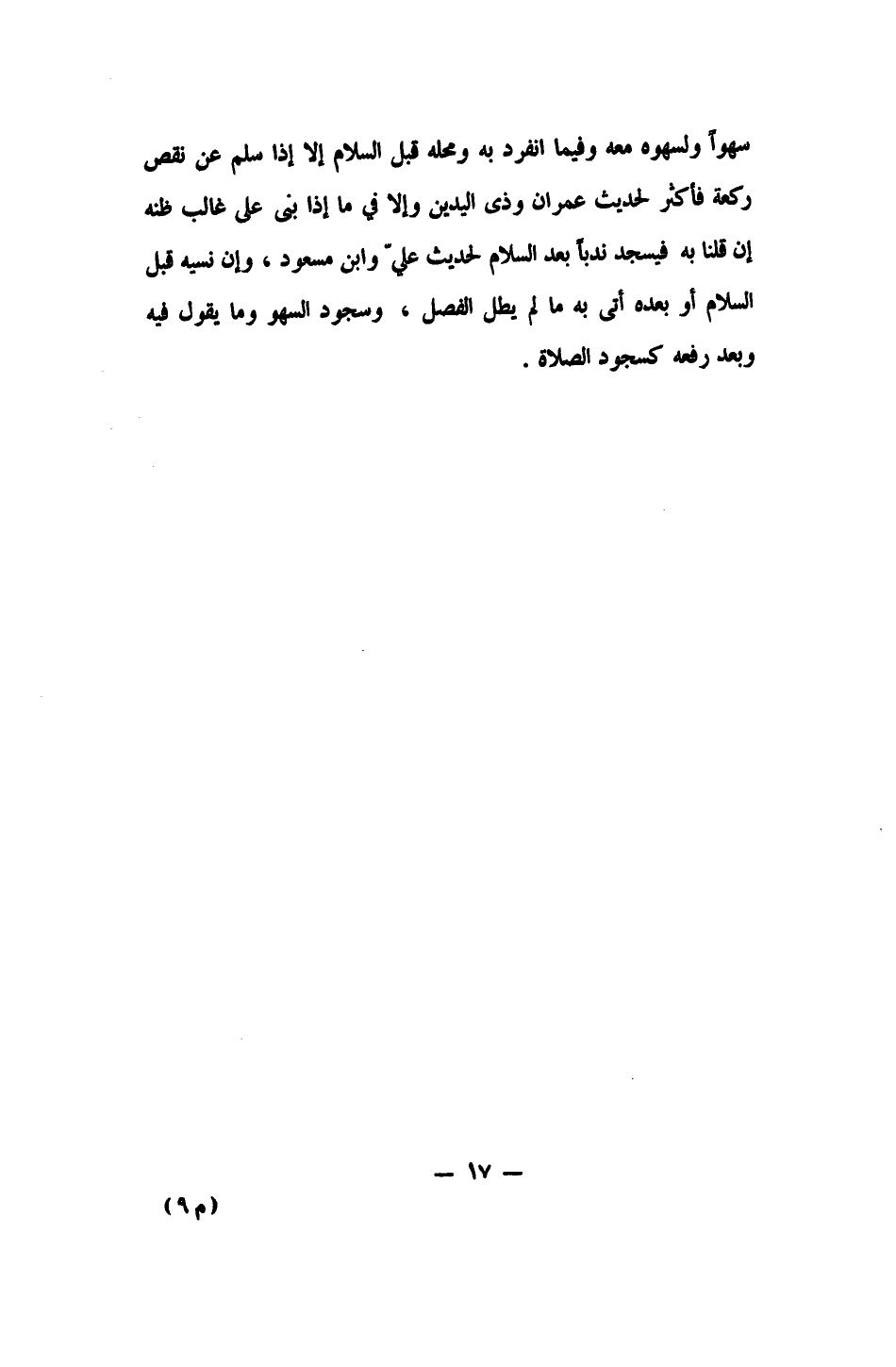 سهوا ولسهوه معه وفيما انفرد به، ومحله قبل السلام إلا إذا سلم عن نقص ركعة فأكثر لحديث عمران وذي اليدين، وإلا في ما إذا بنى على غالب ظنه إن قلنا به فيسجد ندبا بعد السلام، لحديث علي وابن مسعود، وإن نسيه قبل السلام أو بعده أتى به ما لم يطل الفصل، وسجود السهو وما يقول فيه وبعد رفعه كسجود الصلاة.
