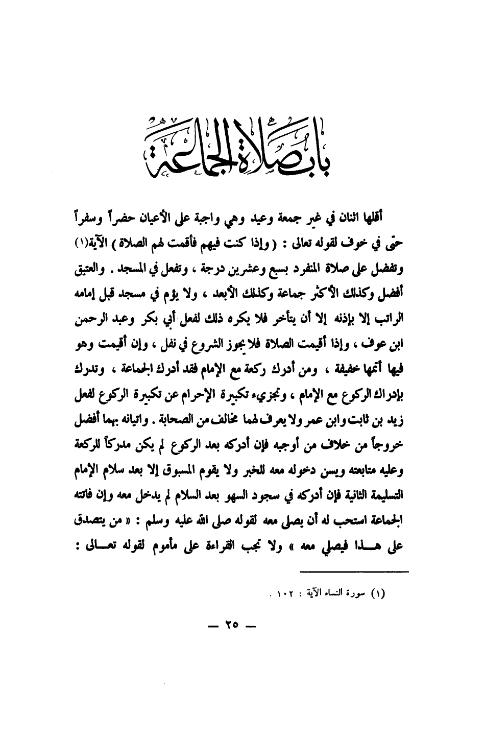 أقلها اثنان في غير جمعة وعيد، وهي واجبة على الأعيان حضرا وسفرا حتى في خوف لقوله تعالى: {وَإِذَا كُنْتَ فِيهِمْ فَأَقَمْتَ لَهُمُ الصَّلاةَ} 1 الآية. وتفضل على صلاة المنفرد بسبع وعشرين درجة، وتفعل في المسجد. والعتيق أفضل، وكذلك الأكثر جماعة، وكذلك الأبعد.