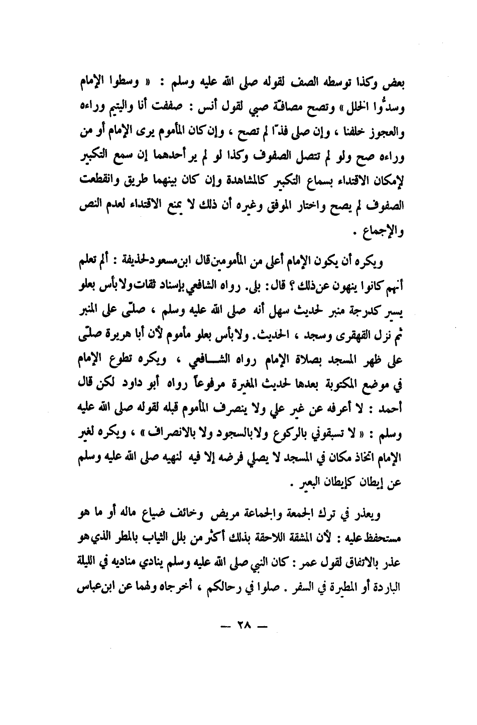 ويكره أن يكون الإمام أعلى من المأمومين قال ابن مسعود لحذيفة: ألم تعلم أنهم كانوا ينهون عن ذلك؟ قال: بلى". رواه الشافعي بإسناد ثقات. ولا بأس بعلو يسير كدرجة منبر لحديث سهل "أنه صلى الله عليه وسلم صلى على المنبر ثم نزل القهقرى وسجد" 2 الحديث. ولا بأس بعلو مأموم لأن "أبا هريرة صلى على ظهر المسجد بصلاة الإمام" رواه الشافعي، ويكره تطوّع الإمام في موضع المكتوبة بعدها، لحديث المغيرة مرفوعا رواه أبو داود لكن قال أحمد: لا أعرفه عن غير علي. ولا ينصرف المأموم قبله لقوله صلى الله عليه وسلم: "لا تسبقوني بالركوع ولا بالسجود ولا بالانصراف" 3. ويكره لغير الإمام اتخاذ مكان في المسجد لا يصلي فرضه إلا فيه لنهيه صلى الله عليه وسلم عن إيطان كإيطان البعير.