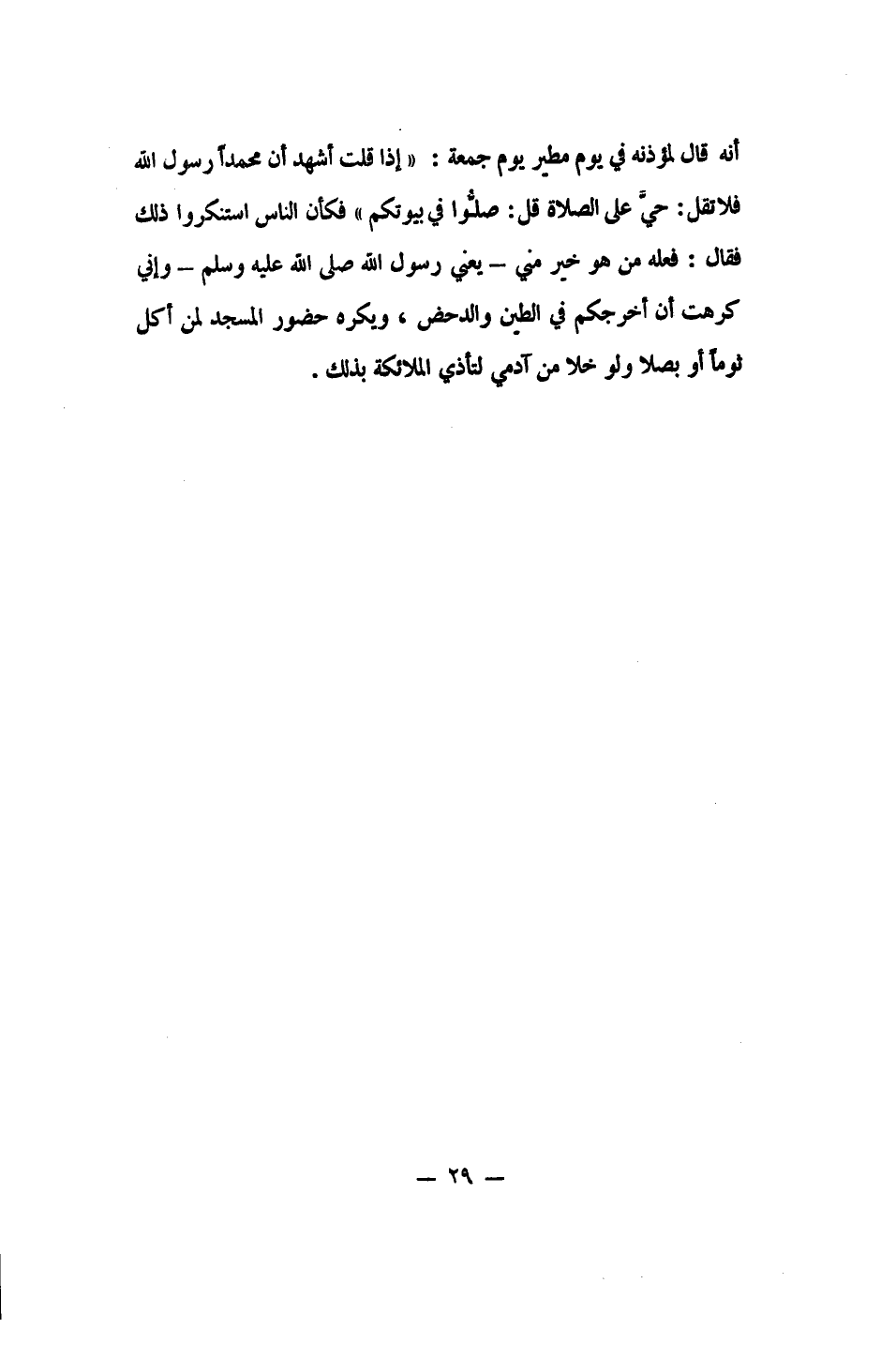 "أنه قال لمؤذنه في يوم مطير يوم جمعة: إذا قلت أشهد أن محمدا رسول الله فلا تقل: حي على الصلاة قل: صلوا في بيوتكم. فكأن الناس استنكروا ذلك فقال: فعله من هو خير مني - يعني رسول الله صلى الله عليه وسلم - وإني كرهت أن أخرجكم في الطين والدحض".