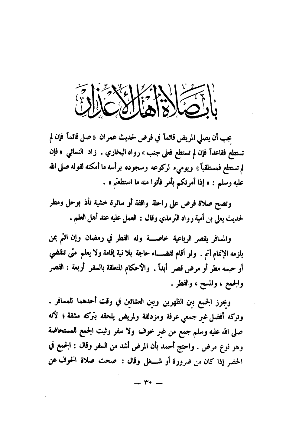 والمسافر يقصر الرباعية خاصة، وله الفطر في رمضان. وإن ائتم بمن يلزمه الإتمام أتم. ولو أقام لقضاء حاجة بلا نية إقامة ولا يعلم متى تنقضي، أو حبسه مطر أو مرض قصر أبدا. والأحكام المتعلقة بالسفر أربعة: القصر والجمع، والمسح، والفطر.