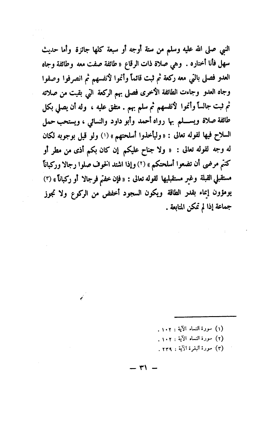 النبي صلى الله عليه وسلم من ستة أوجه أو سبعة كلها جائزة، وأما حديث سهل فأنا أختاره، وهي صلاة ذات الرقاع "طائفة صفت معه وطائفة وجاه العدو، فصلى بالتي معه ركعة، ثم ثبت قائما وأتموا لأنفسهم، ثم انصرفوا وصفوا وجاه العدو. وجاءت الطائفة الأخرى فصلى بهم الركعة التي بقيت من صلاته، ثم ثبت جالسا وأتموا لأنفسهم، ثم سلم بهم" 1 متفق عليه، وله أن يصلي بكل طائفة صلاة ويسلم بها، رواه أحمد وأبو داود والنسائي. ويستحب حمل السلاح فيها لقوله تعالى: {وَلْيَأْخُذُوا حِذْرَهُمْ وَأَسْلِحَتَهُمْ} 2 ولو قيل بوجوبه لكان له وجه لقوله تعالى: {وَلا جُنَاحَ عَلَيْكُمْ إِنْ كَانَ بِكُمْ أَذىً مِنْ مَطَرٍ أَوْ كُنْتُمْ مَرْضَى أَنْ تَضَعُوا أَسْلِحَتَكُمْ} 3.