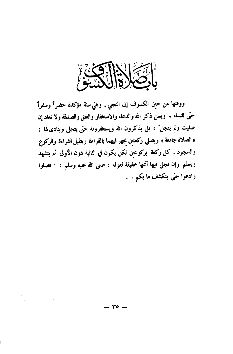ووقتها من حين الكسوف إلى التجلي. وهي سنة مؤكدة حضرا وسفرا حتى للنساء، ويسن ذكر الله والدعاء والاستغفار والعتق والصدقة. ولا تعاد إن صليت ولم يتجل، بل يذكرون الله ويستغفرونه حتى يتجلى. وينادى لها: "الصلاة جامعة". ويصلي ركعتين يجهر فيهما بالقراءة ويطيل القراءة والركوع والسجود، كل ركعة بركوعين، لكن يكون في الثانية دون الأولى، ثم يتشهد ويسلم، وإن تجلى فيها أتمها خفيفة لقوله صلى الله عليه وسلم: "فصلوا وادعوا حتى ينكشف ما بكم" 1.