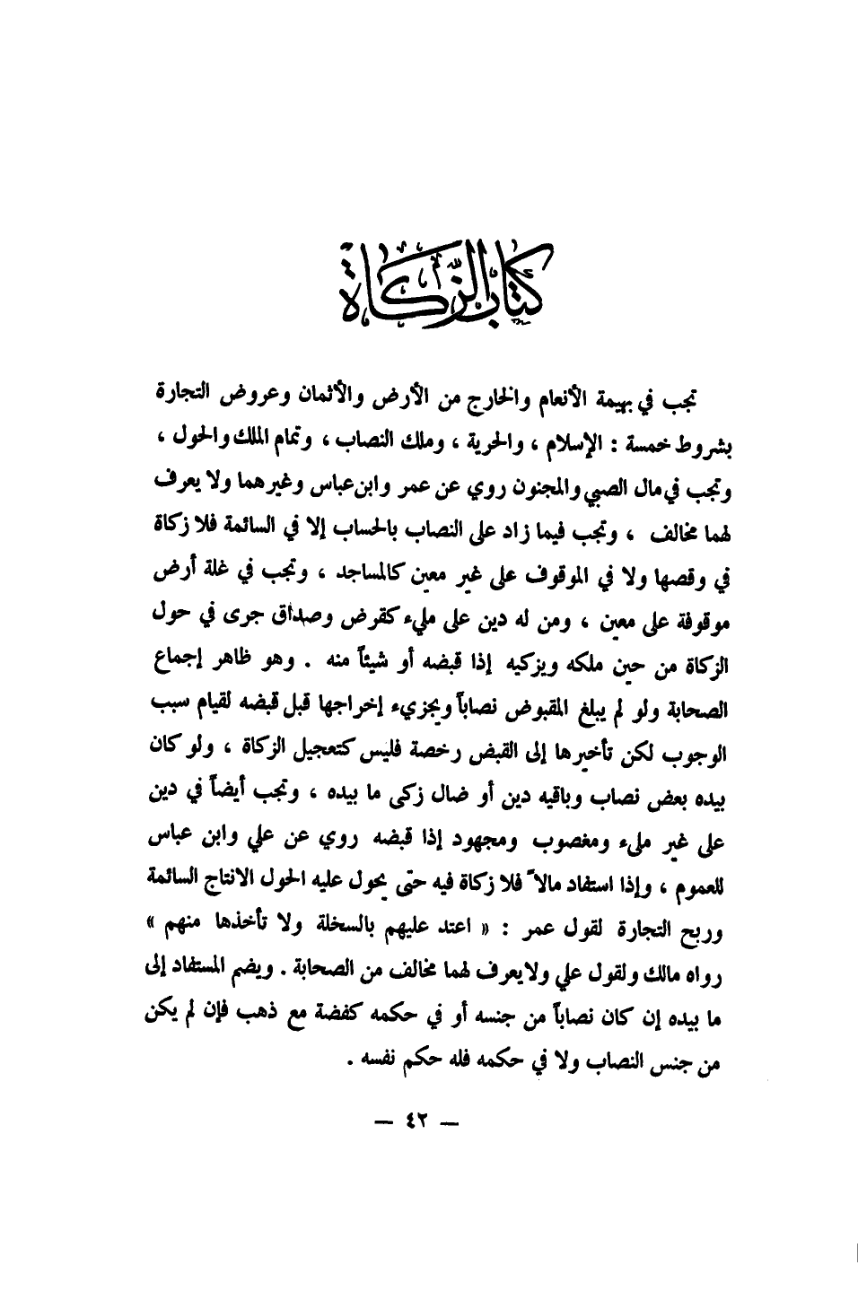 تجب في بهيمة الأنعام والخارج من الأرض والأثمان وعروض التجارة بشروط خمسة: الإسلام، والحرية، وملك النصاب، وتمام الملك والحول، وتجب في مال الصبي والمجنون، روي عن عمر وابن عباس وغيرهما، ولا يعرف لهما مخالف، وتجب فيما زاد على النصاب بالحساب إلا في السائمة فلا زكاة في وقصها، ولا في الموقوف على غير معين كالمساجد، وتجب في غلة أرض موقوفة على معين.