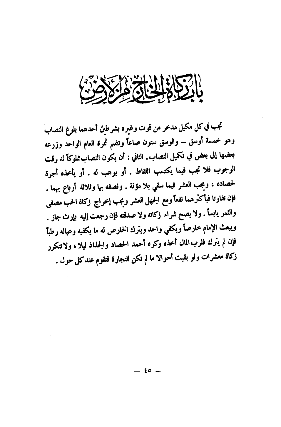 تجب في كل مكيل مدخر من قوت وغيره بشرطين: أحدهما: بلوغ النصاب وهو خمسة أوسق - والوسق ستون صاعا وتضم ثمرة العام الواحد وزرعه بعضها إلى بعض في تكميل النصاب. الثاني: أن يكون النصاب مملوكا له وقت الوجوب، فلا تجب فيما يكتسب اللقاط، أو يوهب له، أو يأخذه أجرة لحصاده. ويجب العشر فيما سقي بلا مؤنة، ونصفه بها، وثلاثة أرباع بهما. فإن تفاوتا فبأكثرهما نفعا، ومع الجهل العشر.
