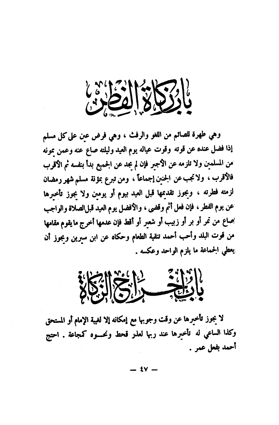 وهي طهرة للصائم من اللغو والرفث، وهي فرض عين على كل مسلم إذا فضل عنده عن قوته وقوت عياله يوم العيد وليلته صاع عنه وعمن يمونه من المسلمين، ولا تلزمه عن الأجير، فإن لم يجد عن الجميع بدأ بنفسه ثم الأقرب فالأقرب. ولا تجب عن الجنين إجماعا، ومن تبرع بمؤنة مسلم شهر رمضان لزمته فطرته. ويجوز تقديمها قبل العيد بيوم أو يومين، ولا يجوز تأخيرها عن يوم الفطر، فإن فعل أثم وقضى، والأفضل يوم العيد قبل الصلاة. والواجب صاع من تمر أو بر أو زبيب أو شعير أو أقط، فإن عدمها أخرج ما يقوم مقامها من قوت البلد. وأحب أحمد تنقية الطعام وحكاه عن ابن سيرين، ويجوز أن يعطي الجماعة ما يلزم الواحد وعكسه.