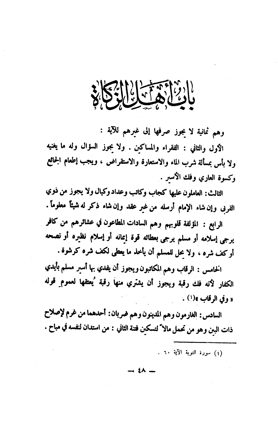 الخامس: الرقاب وهم المكاتبون، ويجوز أن يفدى بها أسير مسلم بأيدي الكفار لأنه فك رقبة، ويجوز أن يشتري منها رقبة ويعتقها لعموم قوله: {وَفِي الرِّقَابِ}
