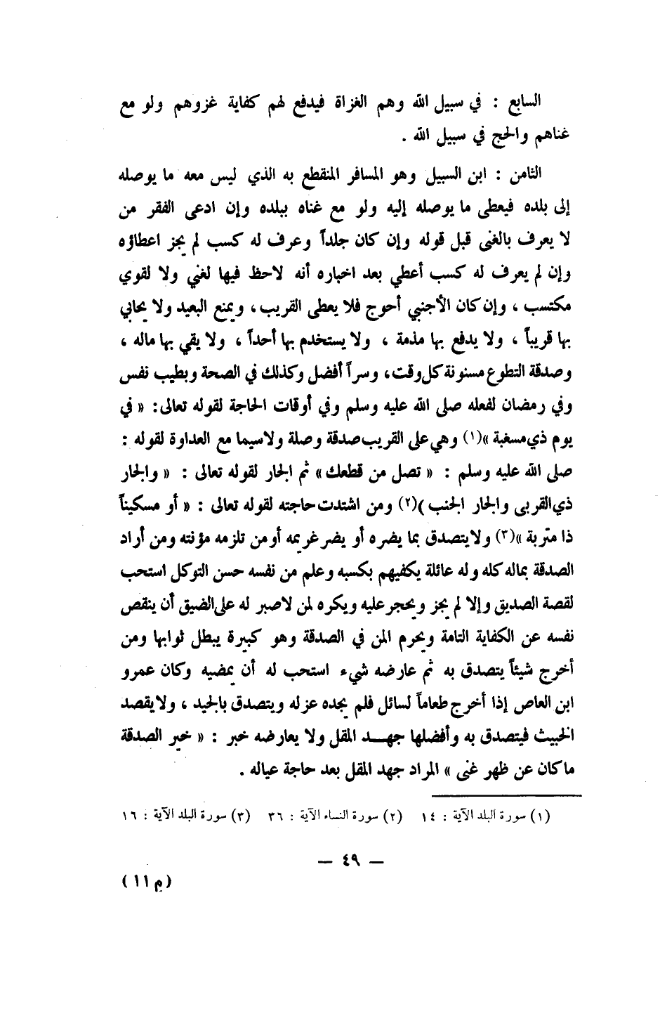 الثامن: ابن السبيل وهو المسافر المنقطع به الذي ليس معه ما يوصله إلى بلده، فيعطى ما يوصله إليه ولو مع غناه ببلده. وإن ادعى الفقر من لا يعرف بالغنى قبل قوله وإن كان جلدا وعرف له كسب لم يجز إعطاؤه، وإن لم يعرف له كسب أعطي بعد إخباره أنه لاحظ فيها لغني ولا لقوي مكتسب. وإن كان الأجنبي أحوج فلا يعطى القريب، ويمنع البعيد ولا يحابي بها قريبا، ولا يدفع بها مذمة، ولا يستخدم بها أحدا، ولا يقي بها ماله.