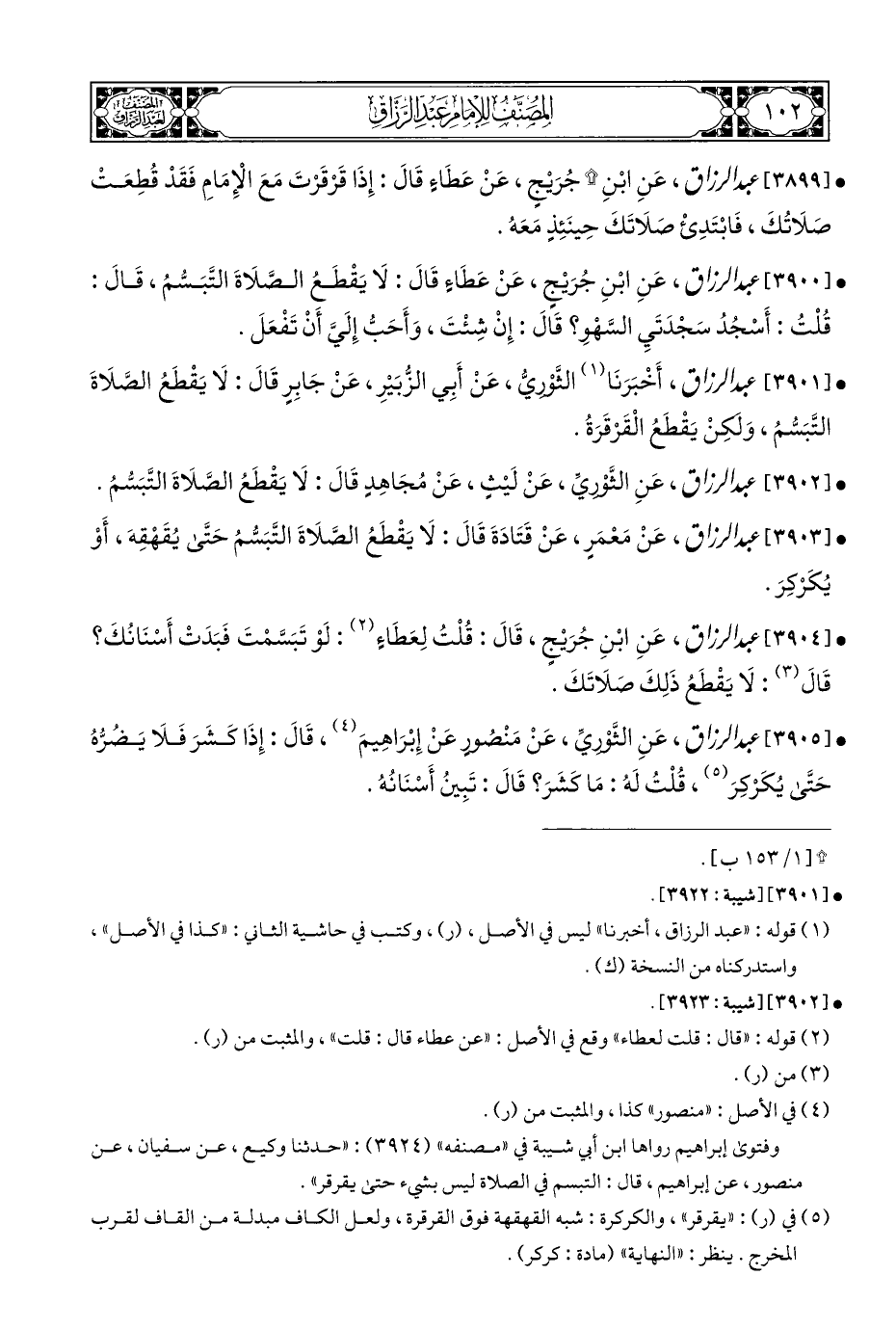 • [٣٩٠٤] عبد الرزاق، عَن ابْنِ جُرَيْجٍ، قَالَ: قُلْتُ لِعَطَاءٍ (¬٢): لَوْ تَبَسَّمْتَ فَبَدَتْ أَسْنَانُكَ؟ قَالَ (¬٣): لَا يَقْطَعُ ذَلِكَ صَلَاتَكَ.