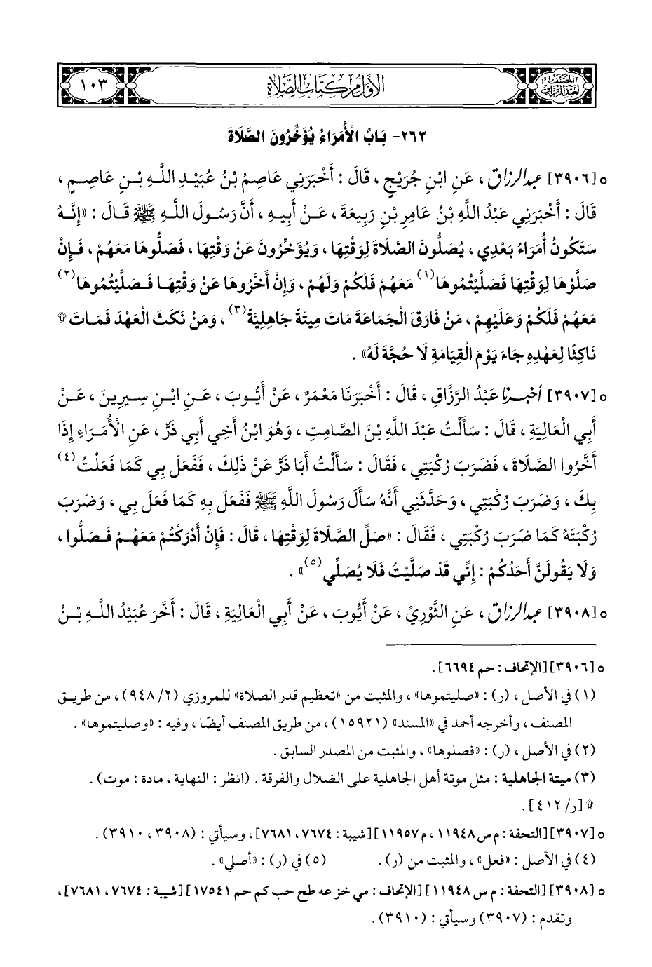 ° [٣٩٠٧] أخبرنا عَبْدُ الرَّزَّاقِ، قَالَ: أَخْبَرَنَا مَعْمَرٌ، عَنْ أَيُّوبَ، عَنِ ابْنِ سِيرِينَ، عَنْ أَبِي الْعَالِيَةِ، قَالَ: سَأَلْتُ عَبْدَ الله بْنَ الصَّامِتِ، وَهُوَ ابْنُ أَخِي أَبِي ذرٍ، عَنِ الْأُمَرَاءِ إِذَا أَخَّرُوا الصَّلَاةَ، فَضَرَبَ رُكْبَتِي، فَقَالَ: سَأَلْتُ أَبَا ذَرٍ عَنْ ذَلِكَ، فَفَعَلَ بِي كَمَا فَعَلْتُ (¬٤) بِكَ، وَضَرَبَ رُكْبَتِي، وَحَدَّثَنِي أَنَّهُ سَأَلَ رَسُولَ اللَّهِ - صلى الله عليه وسلم - فَفَعَلَ بِهِ كَمَا فَعَلَ بِي، وَضَرَبَ رُكْبَتَهُ كَمَا ضَرَبَ رُكْبَتِي، فَقَالَ: "صَلِّ الصَّلاةَ لِوَقْتِهَا، قَالَ: فَإِنْ أَدْرَكْتُمْ مَعَهُمْ فَصَلُّوا، وَلَا يَقُولَنَّ أَحَدُكُمْ: إِنِّي قَدْ صَلَّيْتُ فَلَا يُصَلِّي (¬٥) ".