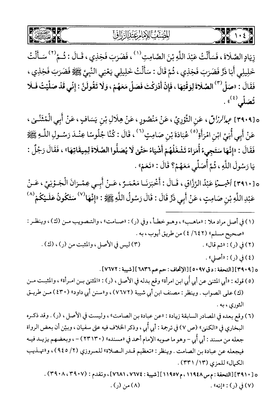 ° [٣٩٠٩] عبد الرزاق، عَنِ الثَّوْرِيِّ، عَنْ مَنْصُورٍ، عَنْ هِلَالِ بْنِ يَسَافٍ، عَنْ أَبِي الْمُثَنَّى، عَنْ أَبِي أُبَيِّ ابْنِ امْرَأَةِ (¬٥) عُبَادَةَ بْنِ صَامِتٍ (¬٦)، قَالَ: كُنَّا جُلُوسًا عِنْدَ رَسُولِ اللَّهِ - صلى الله عليه وسلم - فَقَالَ: "إِنهَا سَتَجِيءُ أُمَرَاءُ تَشْغَلُهُمْ أَشْيَاءُ حَتَّى لَا يُصَلُّوا الصَّلَاةَ لِمِيقَاتِهَا"، فَقَالَ رَجُلٌ: يَا رَسُولَ اللَّهِ، ثُمَّ أُصَلِّي مَعَهُمْ؟ قَالَ: "نَعَمْ".