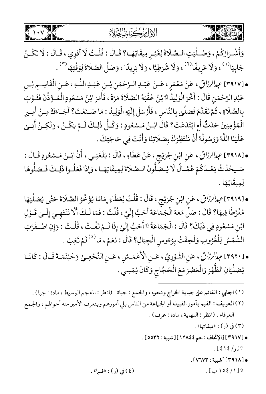 • [٣٩١٩] عبد الرزاق، عَنِ ابْنِ جُرَيْجٍ، قَالَ: قُلْتُ لِعَطَاءٍ إِمَامًا يُوَّخِّرُ الصَّلَاةَ حَتَّى يُصَلِّيَهَا مُفَرِّطًا فِيهَا؟ قَالَ: صَلِّ مَعَهُ الْجَمَاعَةَ أَحَبُّ إِلَيَّ، قُلْتُ: فَمَا لَكَ أَلَّا تَنْتَهِيَ إِلَى قَوْلِ ابْنِ مَسْعُودٍ فِي ذَلِكَ؟ قَالَ: الْجَمَاعَةُ * أَحَبُّ إِلَيَّ إِذَا لَمْ تَفُتْ، قُلْتُ: وإِنِ اصْفَرَّتِ الشَّمْسُ لِلْغُرُوبِ وَلَحِقَتْ بِرُءُوسِ الْجِبَالِ؟ قَالَ: نَعَمْ، مَا (¬٤) لَمْ تَغِبْ.
