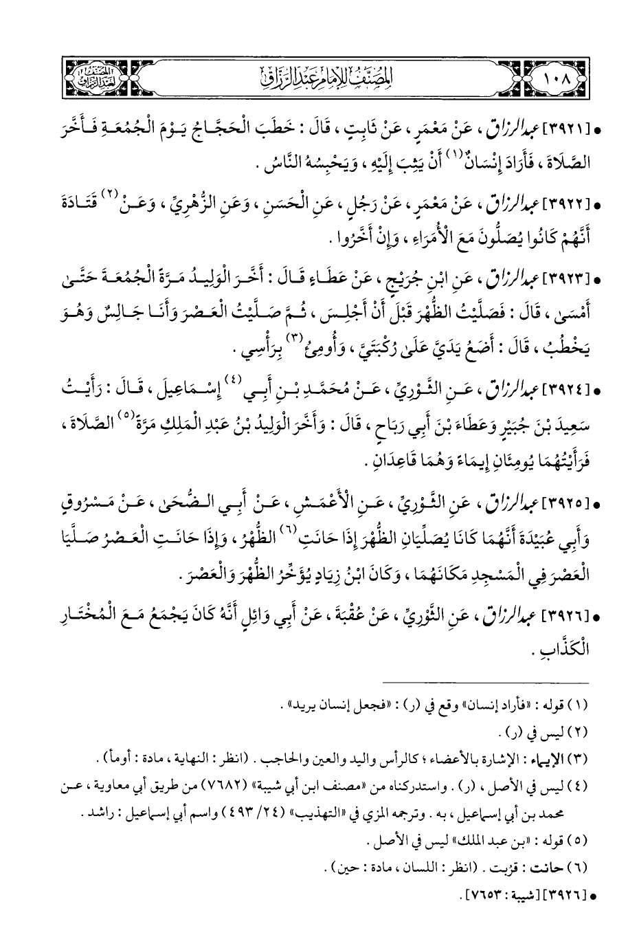 • [٣٩٢٥] عبد الرزاق، عَنِ الثَّوْرِيِّ، عَنِ الْأَعْمَشِ، عَنْ أَبِي الضُّحَى، عَنْ مَسْرُوقٍ وَأَبِي عُبَيْدَةَ أَنَّهُمَا كَانَا يُصَلِّيَانِ الظُّهْرَ إِذَا حَانَتِ (¬٦) الظُّهْرُ، وإِذَا حَانَتِ الْعَصْرُ صَلَّيَا الْعَصْرَ فِي الْمَسْجِدِ مَكَانَهُمَا، وَكَانَ ابْنُ زِيَادٍ يُوَّخِّرُ الظُّهْرَ وَالْعَصْرَ.