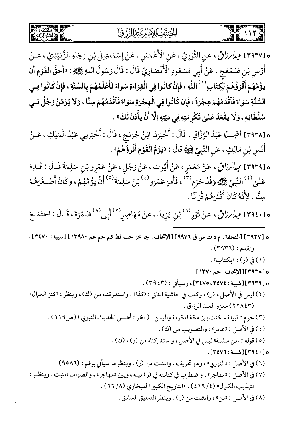 ° [٣٩٣٨] أخبرنا عَبْدُ الرَّزَّاقِ، قَالَ: أَخْبَرَنَا ابْنُ جُرَيْجٍ، قَالَ: أَخْبَرَنِي عَبْدُ الْمَلِكِ، عَنْ أَنَسِ بْنِ مَالِكٍ، عَنِ النَّبِيِّ - صلى الله عليه وسلم - قَالَ: "يَؤُمُ الْقَوْمَ أَقْرَؤُهُمْ".