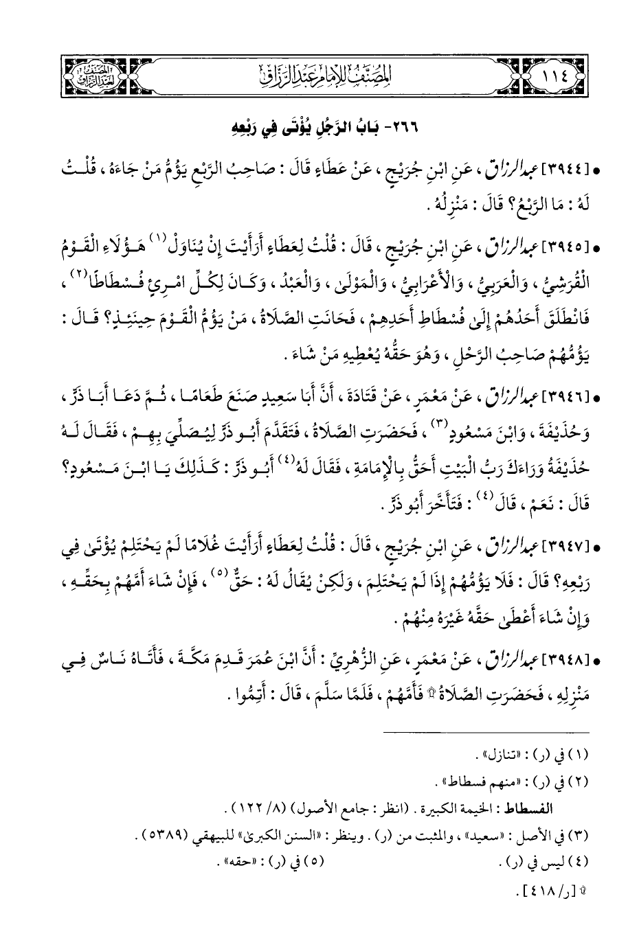• [٣٩٤٥] عبد الرزاق، عَنِ ابْنِ جُرَيْجٍ، قَالَ: قُلْتُ لِعَطَاءٍ أَرَأَيْتَ إِنْ يُنَاوَلْ (¬١) هَؤُلَاءِ الْقَوْمُ الْقُرَشِيُّ، وَالْعَرَبِيُّ، وَالْأَعْرَابِيُّ، وَالْمَوْلَى، وَالْعَبْدُ، وَكَانَ لِكُلِّ امْرِئٍ فُسْطَاطًا (¬٢)، فَانْطَلَقَ أَحَدُهُمْ إِلَى فُسْطَاطِ أَحَدِهِمْ، فَحَانَتِ الصَّلَاةُ، مَنْ يَؤُمُّ الْقَوْمَ حِينَئِذٍ؟ قَالَ: يَؤُمُّهُمْ صَاحِبُ الرَّحْلِ، وَهُوَ حَقُّهُ يُعْطِيهِ مَنْ شَاءَ.