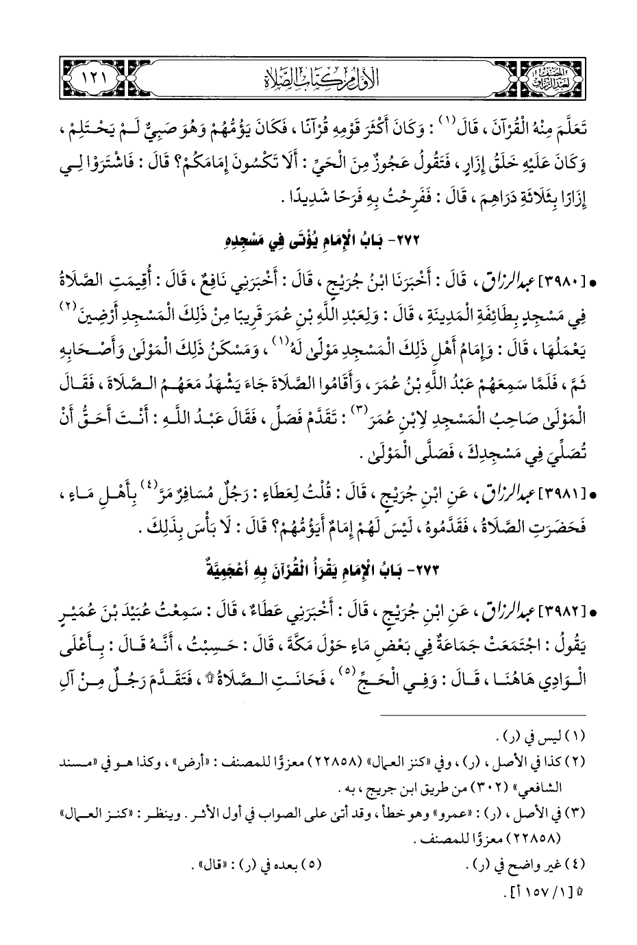 • [٣٩٨٠] عبد الرزاق، قَالَ: أَخْبَرَنَا ابْنُ جُرَيْجٍ، قَالَ: أَخْبَرَنِي نَافِعٌ، قَالَ: أُقِيمَتِ الصَّلَاةُ فِي مَسْجِدٍ بِطَائِفَةِ الْمَدِينَةِ، قَالَ: وَلِعَبْدِ اللَّهِ بْنِ عُمَرَ قَرِيبًا مِنْ ذَلِكَ الْمَسْجِدِ أَرْضِينَ (¬٢) يَعْمَلُهَا، قَالَ: وإمَامُ أَهْلِ ذَلِكَ الْمَسْجِدِ مَوْلًى لَهُ (١)، وَمَسْكَنُ ذَلِكَ الْمَوْلَى وَأَصْحَابِهِ ثَمَّ، فَلَمَّا سَمِعَهُمْ عَبْدُ اللهِ بْنُ عُمَرَ، وَأَقَامُوا الصَّلَاةَ جَاءَ يَشْهَدُ مَعَهُمُ الصَّلَاةَ، فَقَالَ الْمَوْلَى صَاحِبُ الْمَسْجِدِ لاِبْنِ عُمَرَ (¬٣): تَقَدَّمْ فَصَلِّ، فَقَالَ عَبْدُ اللَّهِ: أَنْتَ أَحَقُّ أَنْ تُصَلِّيَ فِي مَسْجِدِكَ، فَصَلَّى الْمَوْلَى.