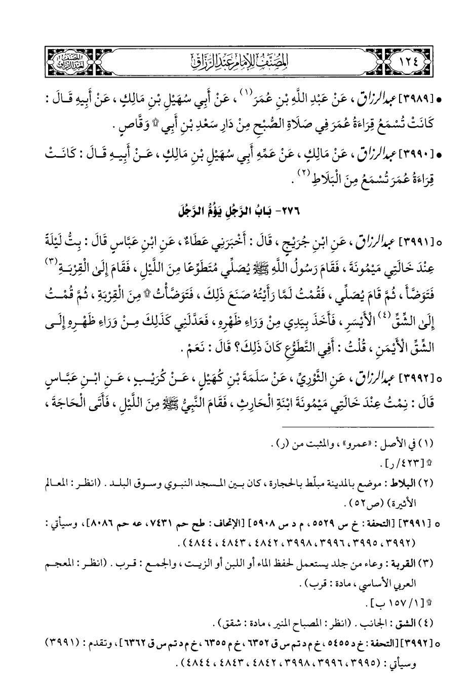 ° [٣٩٩٢] عبد الرزاق، عَنِ الثَّوْرِيِّ، عَنْ سَلَمَةَ بْنِ كُهَيْلٍ، عَنْ كُرَيْبٍ، عَنِ ابْنِ عَبَّاسٍ قَالَ: نِمْتُ عِنْدَ خَالَتِي مَيْمُونَةَ ابْنَةِ الْحَارِثِ، فَقَامَ النَّبِيُّ - صلى الله عليه وسلم - مِنَ اللَّيْلِ، فَأَتَى الْحَاجَةَ،