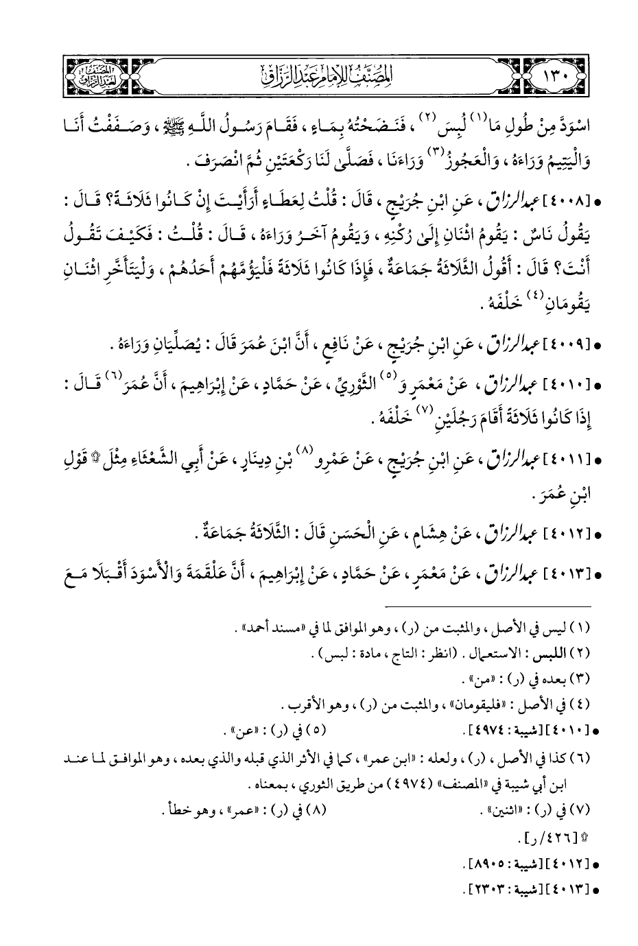 • [٤٠١٠] عبد الرزاق، عَنْ مَعْمَرٍ وَ (¬٥) الثَّوْرِيِّ، عَنْ حَمَّادٍ، عَنْ إِبْرَاهِيمَ، أَنَّ عُمَرَ (¬٦) قَالَ: إِذَا كَانُوا ثَلَاثَةً أَقَامَ رَجُلَيْنِ (¬٧) خَلْفَهُ.