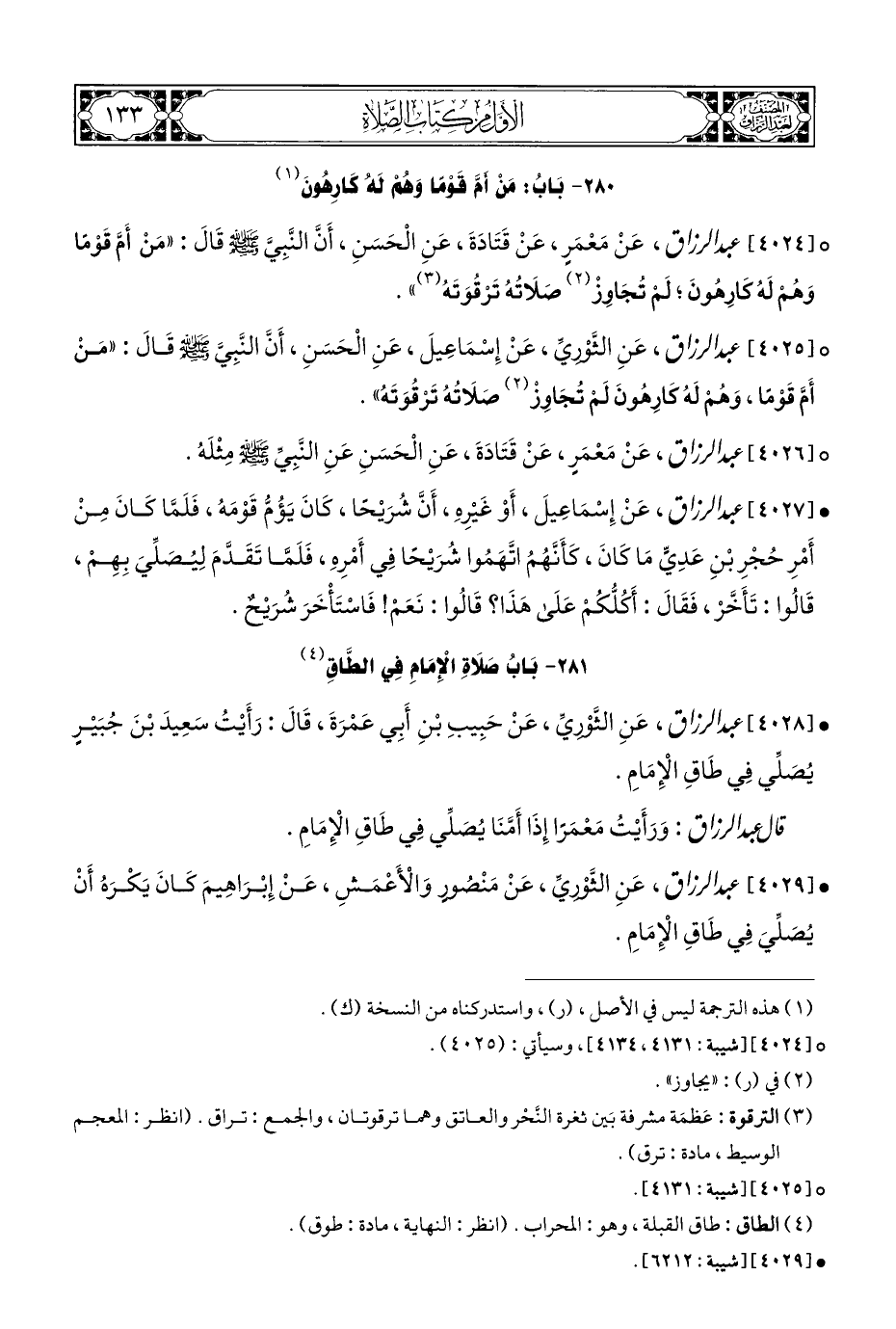 ° [٤٠٢٥] عبد الرزاق، عَنِ الثَّوْرِيِّ، عَنْ إِسْمَاعِيلَ، عَنِ الْحَسَنِ، أَنَّ النَّبِيَّ - صلى الله عليه وسلم - قَالَ: "مَنْ أَمَّ قَوْمًا، وَهُمْ لَهُ كَارِهُونَ لَمْ تُجَاوِزْ (٢) صَلَاتُهُ تَرْقُوَتَهُ".