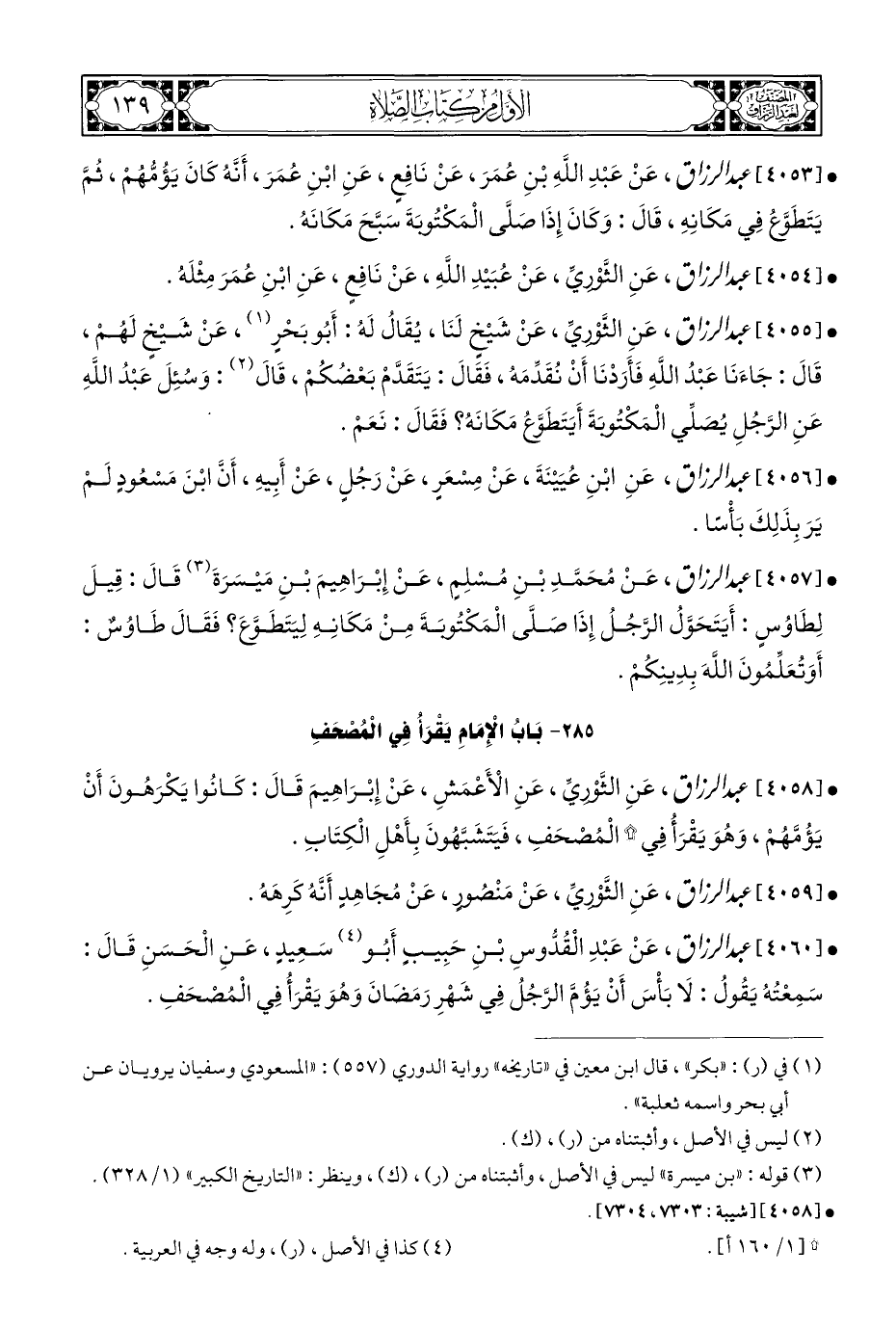 • [٤٠٥٨] عبد الرزاق، عَنِ الثَّوْرِيِّ، عَنِ الْأَعْمَشِ، عَنْ إِبْرَاهِيمَ قَالَ: كَانُوا يَكْرَهُونَ أَنْ يَؤُمَّهُمْ، وَهُوَ يَقْرَأُ فِي * الْمُصحَفِ، فَيَتَشَبَّهُونَ بِأَهْلِ الْكِتَابِ.