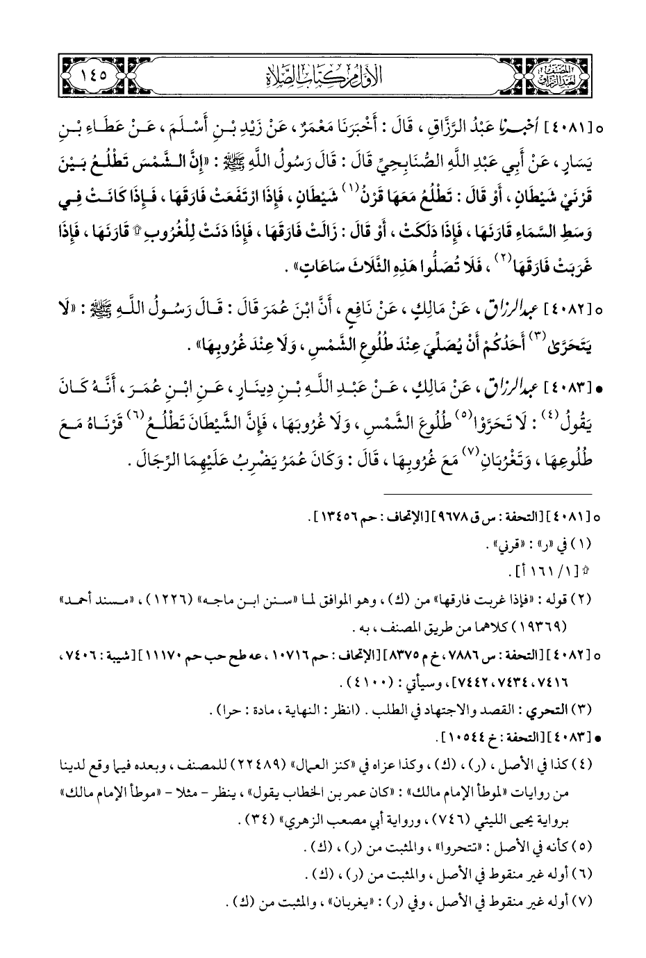 ° [٤٠٨١] أخبرنا عَبْدُ الرَّزَّاقِ، قَالَ: أَخْبَرَنَا مَعْمَرٌ، عَنْ زَيْدِ بْنِ أَسْلَمَ، عَنْ عَطَاءِ بْنِ يَسَارٍ، عَنْ أَبِي عَبْدِ اللَّهِ الصُّنَابِحِيِّ قَالَ: قَالَ رَسُولُ اللَّهِ - صلى الله عليه وسلم -: "إِنَّ الشَّمْسَ تَطْلُعُ بَيْنَ قَرْنَىْ شَيْطَانٍ، أَوْ قَالَ: تَطْلُعُ مَعَهَا قَرْنُ (¬١) شَيْطَانٍ، فَإِذَا ارْتَفَعَتْ فَارَقَهَا، فَإِذَا كَانَتْ فِي وَسَطِ السَّمَاءِ قَارَنَهَا، فَإِذَا دَلَكَتْ، أَوْ قَالَ: زَالَتْ فَارَقَهَا، فَإِذَا دَنَتْ لِلْغُرُوبِ * قَارَنَهَا، فَإِذَا غَرَبَتْ فَارَقَهَا (¬٢)، فَلَا تُصَلُّوا هَذِهِ الثَّلَاثَ سَاعَاتٍ".