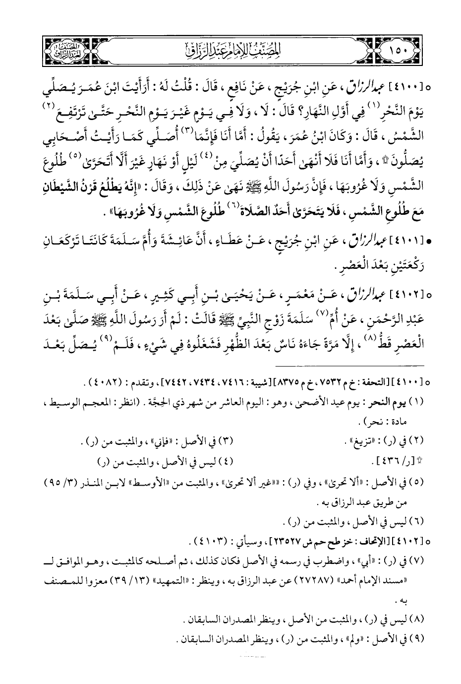 ° [٤١٠٠] عبد الرزاق، عَنِ ابْنِ جُرَيْجٍ، عَنْ نَافِعٍ، قَالَ: قُلْتُ لَهُ: أَرَأَيْتَ ابْنَ عُمَرَ يُصَلِّي يَوْمَ النَّحْرِ (¬١) فِي أَوَّلِ النَّهَارِ؟ قَالَ: لَا، وَلَا فِي يَوْمٍ غَيْرَ يَوْمِ النَّحْرِ حَتَّى تَرْتَفِعَ (¬٢) الشَمْسُ، قَالَ: وَكَانَ ابْنُ عُمَرَ، يَقُولُ: أَمَّا أَنَا فَإِنَّمَا (¬٣) أُصَلِّي كَمَا رَأَيْتُ أَصْحَابِي يُصَلُّونَ*، وَأَمَّا أَنَا فَلَا أَنْهَى أَحَدًا أَنْ يُصَلِّيَ مِنْ (¬٤) لَيْلِ أَوْ نَهَارٍ غَيْرَ أَلَّا أَتَحَرَّى (¬٥) طُلُوعَ الشَّمْسِ وَلَا غُرُوبَهَا، فَإِنَّ رَسُولَ اللَّهِ - صلى الله عليه وسلم - نَهَى عَن ذَلِكَ، وَقَالَ: "إِنَّهُ يَطْلُعُ قَرْنُ الشَّيْطَانِ مَعَ طُلُوعِ الشَّمْسِ، فَلَا يَتَحَرَّى أَحَدٌ الصَّلَاةَ (¬٦) طُلُوعَ الشَّمْسِ وَلَا غُرُوبَهَا".