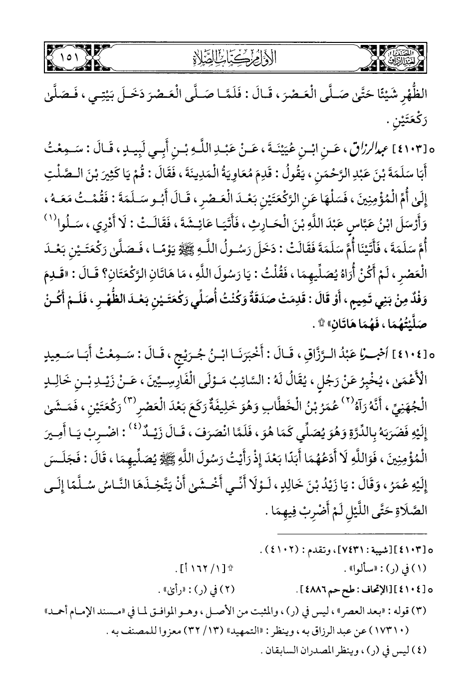 ° [٤١٠٤] أخبلانا عَبْدُ الرَّزَّاقِ، قَالَ: أَخْبَرَنَا ابْنُ جُرَيْجٍ، قَالَ: سَمِعْتُ أَبَا سَعِيدٍ الأَعْمَي، يُخْبِرُ عَنْ رَجُلٍ، يُقَالُ لَهُ: السَّائِبُ مَوْلَى الْفَارِسِيِّينَ، عَنْ زَيْدِ بْنِ خَالِدٍ الْجُهَنِيِّ، أَنَّهُ رَآهُ (¬٢) عُمَرُ بْنُ الْخَطَّابِ وَهُوَ خَلِيفَةٌ رَكَعَ بَعْدَ الْعَصْرِ (¬٣) رَكْعَتَيْنِ، فَمَشَى إِلَيْهِ فَضَرَبَهُ بِالدِّرَّةِ وَهُوَ يُصَلّي كَمَا هُوَ، فَلَمَّا انْصَرَفَ، قَالَ زَيْدٌ (¬٤): اضْرِبْ يَا أَمِيرَ الْمُؤْمِنِينَ، فَوَاللَّهِ لَا أَدَعُهُمَا أَبَدًا بَعْدَ إِذْ رَأَيْتُ رَسُولَ اللَّهِ - صلى الله عليه وسلم - يُصَلِّيهِمَا، قَالَ: فَجَلَسَ إِلَيْهِ عُمَرُ، وَقَالَ: يَا زَيْدُ بْنَ خَالِدٍ، لَوْلَا أَنَي أَخْشَى أَنْ يَتَّخِذَهَا النَّاسُ سُلَّمًا إِلَى الصَّلَاةِ حَتَّى اللَّيْلِ لَمْ أَضْرِبْ فِيهِمَا.