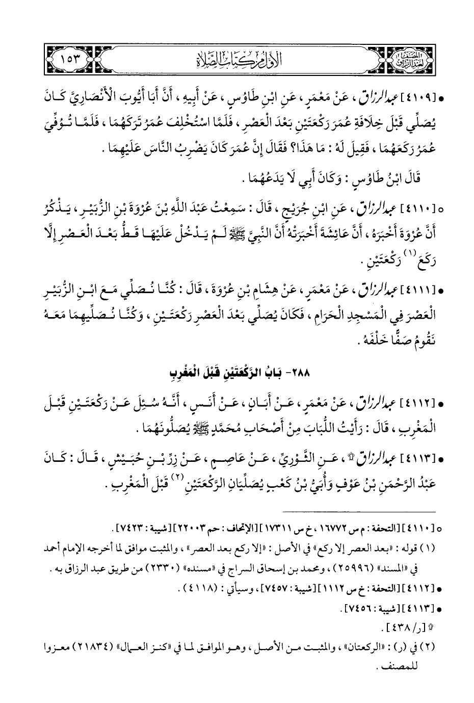 ° [٤١١٠] عبد الرزاق، عَنِ ابْنِ جُرَيْجٍ، قَالَ: سَمِعْتُ عَبْدَ اللَّهِ بْنَ عُرْوَةَ بْنِ الزُّبَيْرِ، يَذْكُرُ أَنَّ عُرْوَةَ أَخْبَرَهُ، أَنَّ عَائِشَةَ أَخْبَرَتْهُ أَنَّ النَّبِي - صلى الله عليه وسلم - لَمْ يَدْخُلْ عَلَيْهَا قَطُّ بَعْدَ الْعَصْرِ إِلَّا رَكعَ (¬١) رَكعَتيْنِ.
