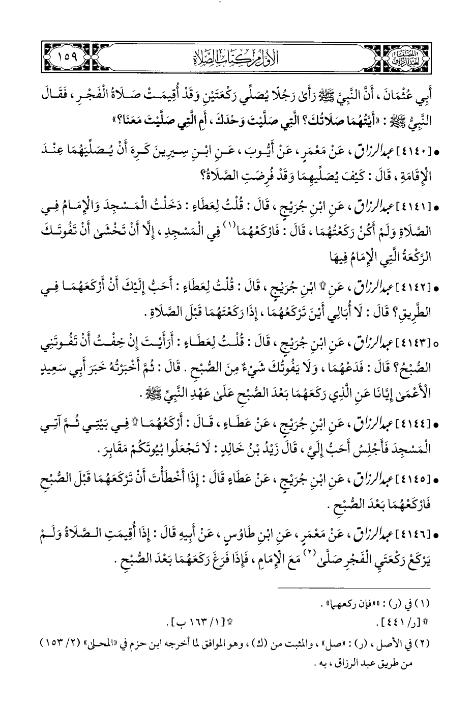 ° [٤١٤٣] عبد الرزاق، عَنِ ابْنِ جُرَيْجٍ، قَالَ: قُلْتُ لِعَطَاءٍ: أَرَأَيْتَ إِنْ خِفْتُ أَنْ تَفُوتَنِي الصُّبْحُ؟ قَالَ: فَدَعْهُمَا، وَلَا يَفُوتُكَ شَيءٌ مِنَ الصُّبْحِ. قَالَ: ثُمَّ أَخْبَرْتُهُ خَبَرَ أَبِي سَعِيدٍ الْأَعْمَى إِيَّانَا عَنِ الَّذِي رَكَعَهُمَا بَعْدَ الصُّبْحِ عَلَى عَهْدِ النَّبِيِّ - صلى الله عليه وسلم -.