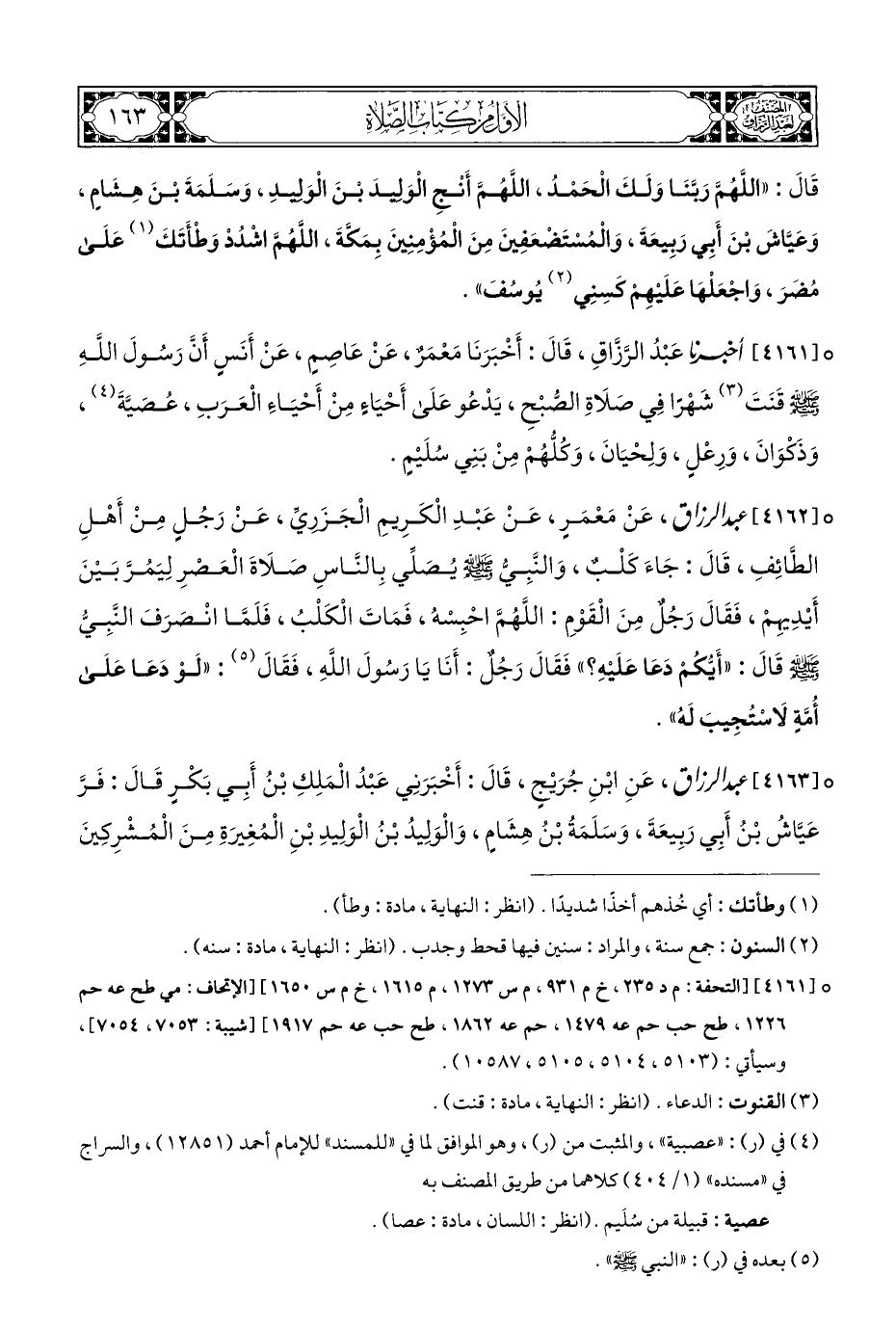 ° [٤١٦١] أخبرنا عَبْدُ الرَّزَّاقِ، قَالَ: أَخْبَرَنَا مَعْمَرٌ، عَنْ عَاصِمٍ، عَنْ أَنَسٍ أَنَّ رَسُولَ اللَّهِ - صلى الله عليه وسلم - قَنَتَ (¬٣) شَهْرًا فِي صَلَاةِ الصُّبْحِ، يَدْعُو عَلَى أَحْيَاءٍ مِنْ أَحْيَاءَ الْعَرَبِ، عُصَيَّةَ (¬٤)، وَذَكْوَانَ، وَرِعْلٍ، وَلِحْيَانَ، وَكُلُّهُمْ مِنْ بَنِي سُلَيْمٍ.