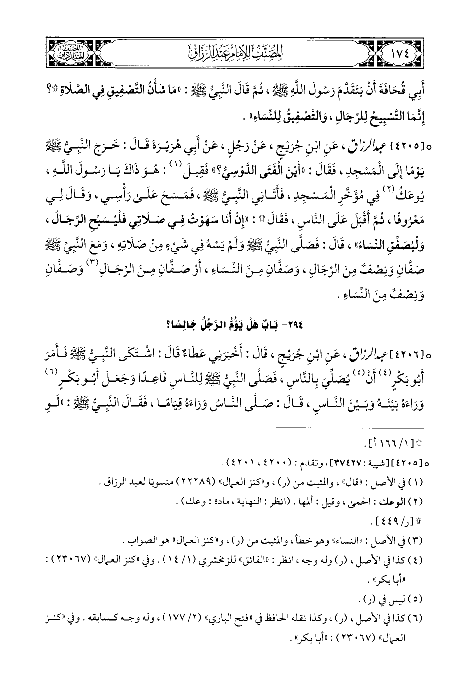 ° [٤٢٠٥] عبد الرزاق، عَنِ ابْنِ جُرَيْجٍ، عَنْ رَجُلٍ، عَنْ أَبِي هُرَيْرَةَ قَالَ: خَرَج النَّبِيُّ - صلى الله عليه وسلم - يَوْمًا إِلَى الْمَسْجِدِ، فَقَالَ: "أَيْنَ الْفَتَى الدَّوْسِيُّ؟ " فَقِيلَ (¬١): هُوَ ذَاكَ يَا رَسُولَ اللَّهِ، يُوعَكُ (¬٢) مُؤَخَّرِ الْمَسْجِدِ، فَأَتَانِي النَّبِيُّ - صلى الله عليه وسلم -، فَمَسَحَ عَلَى رَأْسِي، وَقَالَ لِي مَعْرُوفًا، ثُمَّ أَقْبَلَ عَلَى النَّاسِ، فَقَالَ *: "إِنْ أَنَا سَهَوْتُ فِي صَلَاتِي فَلْيُسَبِّحِ الرِّجَالُ، وَلْيُصَفِّقِ النِّسَاءُ"، قَالَ: فَصلَّى النَّبِيُّ - صلى الله عليه وسلم -! وَلَمْ يَسْهُ فِي شَيءٍ مِنْ صَلَاتِهِ، وَمَعَ النَّبِيِّ - صلى الله عليه وسلم - صَفَّانِ وَنِصْفٌ مِنَ الرِّجَالِ، وَصَفَّانِ مِنَ النِّسَاءِ، أَوْ صَفَّانِ مِنَ الرِّجَالِ (¬٣) وَصَفَّانِ وَنِصْفٌ مِنَ النِّسَاءِ.