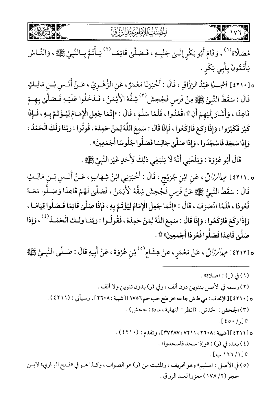 ° [٤٢١١] عبد الرزاق، عَنِ ابْنِ جُرَيْجٍ، قَالَ: أَخْبَرَنِي ابْنُ شِهَابٍ، عَنْ أَنَسِ بْنِ مَالِكٍ قَالَ: سَقَطَ النَّبِيُّ - صلى الله عليه وسلم - عَنْ فَرَسٍ فَجُحِشَ شِقُّهُ الْأَيْمَنُ، فَصَلَّى لَهُمْ قَاعِدًا وَصَلُّوا مَعَهُ قُعُودًا، فَلَمَّا انْصَرَفَ، قَالَ: "إِنمَا جُعِلَ الْإِمَامُ لِيُؤْتَمَّ بِهِ، فَإِذَا صَلَّى قَائِمَا فَصَلُّوا قِيَامًا، وَإِذَا رَكَعَ فَارْكَعُوا، وإِذَا قَالَ: سَمِعَ اللَّهُ لِمَنْ حَمِدَهُ، فَقُولُوا: رَبَّنَا وَلَكَ الْحَمْدُ (¬٤)، وإِذَا صَلَّى قَاعِدًا فَصَلُّوا قُعُودًا أَجْمَعِينَ" *.
