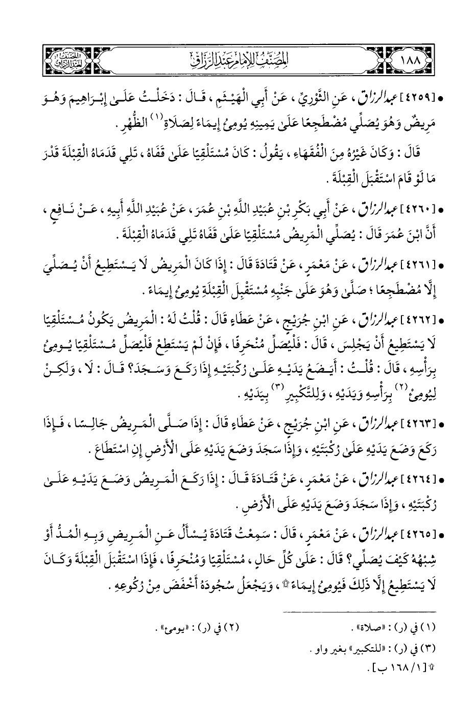 • [٤٢٥٩] عبد الرزاق، عَنِ الثَّوْريِّ، عَنْ أَبِي الْهَيْثَمِ، قَالَ: دَخَلْتُ عَلَى إِبْرَاهِيمَ وَهُوَ مَرِيضٌ وَهُوَ يُصلِّي مُضْطَجِعًا عَلَى يَمِينِهِ يُومِئُ إِيمَاءً لِصَلَاةِ (¬١) الظُّهْرِ.