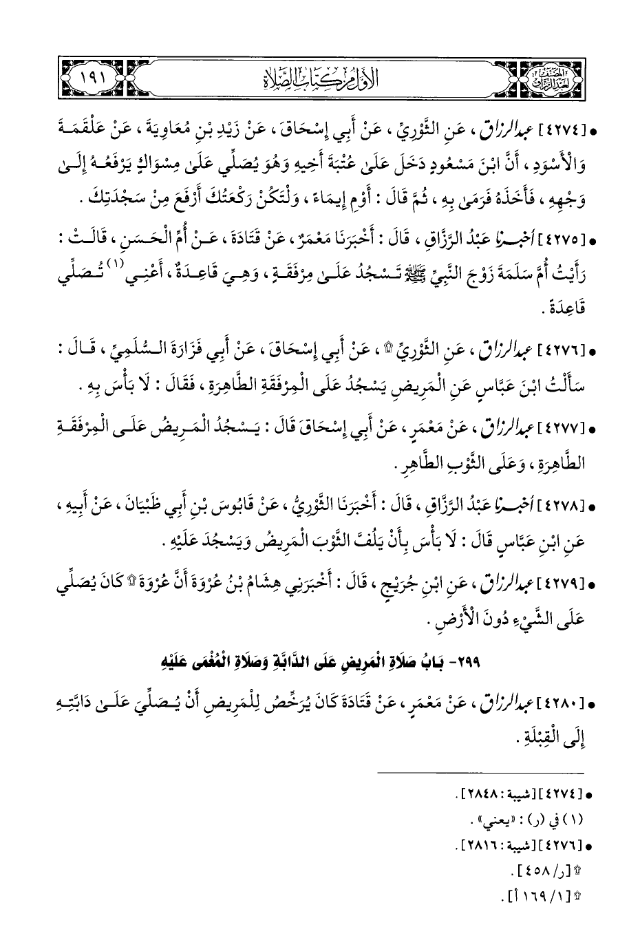 • [٤٢٧٥] أخبرنا عَبْدُ الرَّزَّاقِ، قَالَ: أَخْبَرَنَا مَعْمَرٌ، عَنْ قَتَادَةَ، عَنْ أُمِّ الْحَسَنِ، قَالَتْ: رَأَيْتُ أُمَّ سَلَمَةَ زَوْجَ النَّبِيِّ - صلى الله عليه وسلم - تَسْجُدُ عَلَى مِرْفَقَةٍ، وَهِيَ قَاعِدَةٌ، أَعْنِي (¬١) تُصَلِّي قَاعِدَةً.