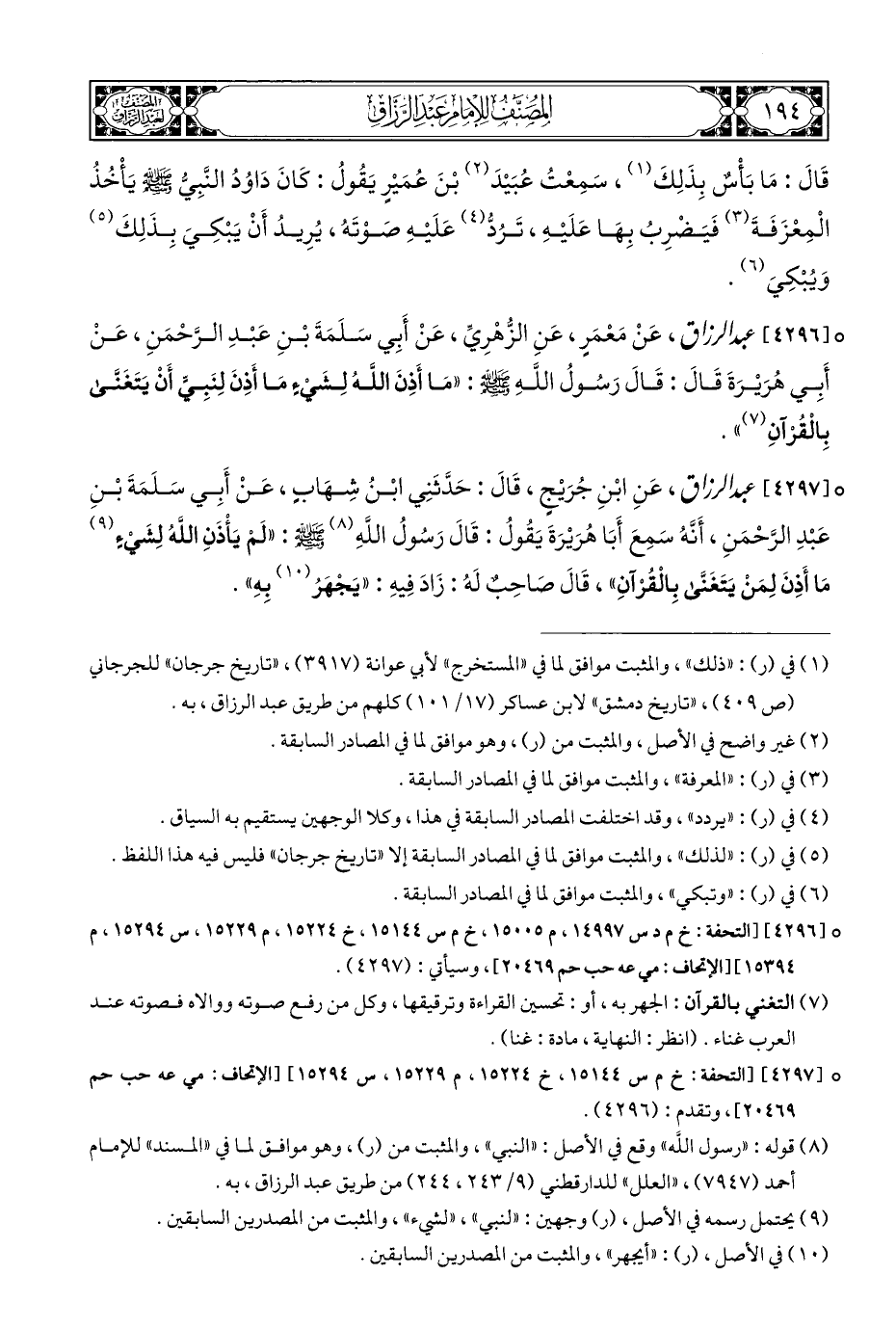 ° [٤٢٩٧] عبد الرزاق، عَنِ ابْنِ جُرَيْجٍ، قَالَ: حَدَّثَنِي ابْنُ شِهَابٍ، عَنْ أَبِي سَلَمَةَ بْنِ عَبْدِ الرَّحْمَنِ، أَنَّهُ سَمِعَ أَبَا هُرَيْرَةَ يَقُولُ: قَالَ رَسُولُ اللَّهِ (¬٨) - صلى الله عليه وسلم -: "لَمْ يَأْذَنِ اللَّهُ لِشَيْءٍ (¬٩) مَا أَذِنَ لِمَنْ يَتَغَنَّى بِالْقُرْآنِ"، قَالَ صَاحِبٌ لَهُ: زَادَ فِيهِ: "يَجْهَرُ (¬١٠) بِهِ".