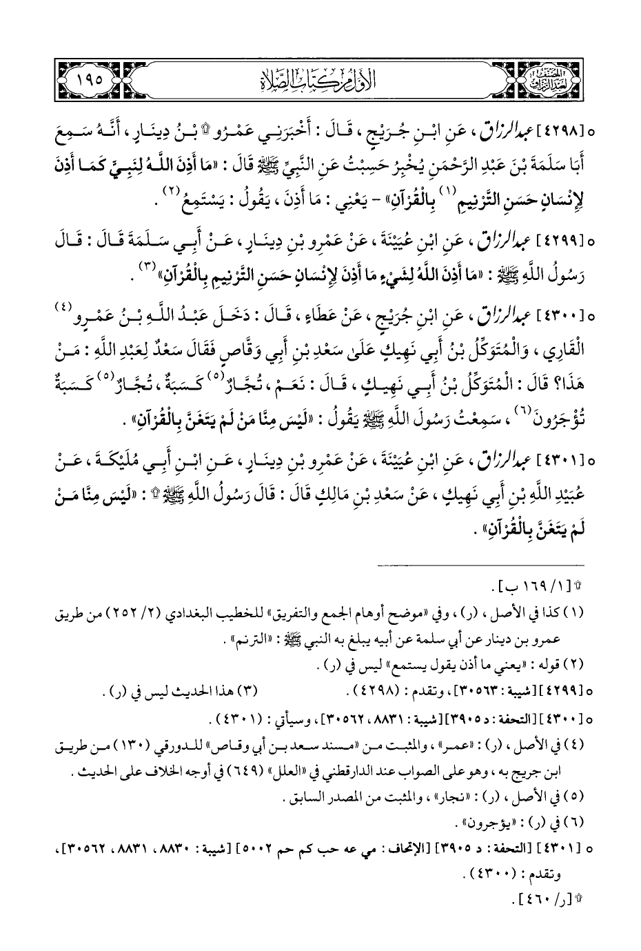° [٤٢٩٩] عبد الرزاق، عَنِ ابْنِ عُيَيْنَةَ، عَنْ عَمْرِو بْنِ دِينَارٍ، عَنْ أَبِي سَلَمَةَ قَالَ: قَالَ رَسُولُ اللَّهِ - صلى الله عليه وسلم -: "مَا أَذِنَ اللَّهُ لِشَيْءٍ مَا أَذِنَ لإِنْسَانٍ حَسَنِ التَّرْنِيمِ بِالْقُرْآنِ" (¬٣).