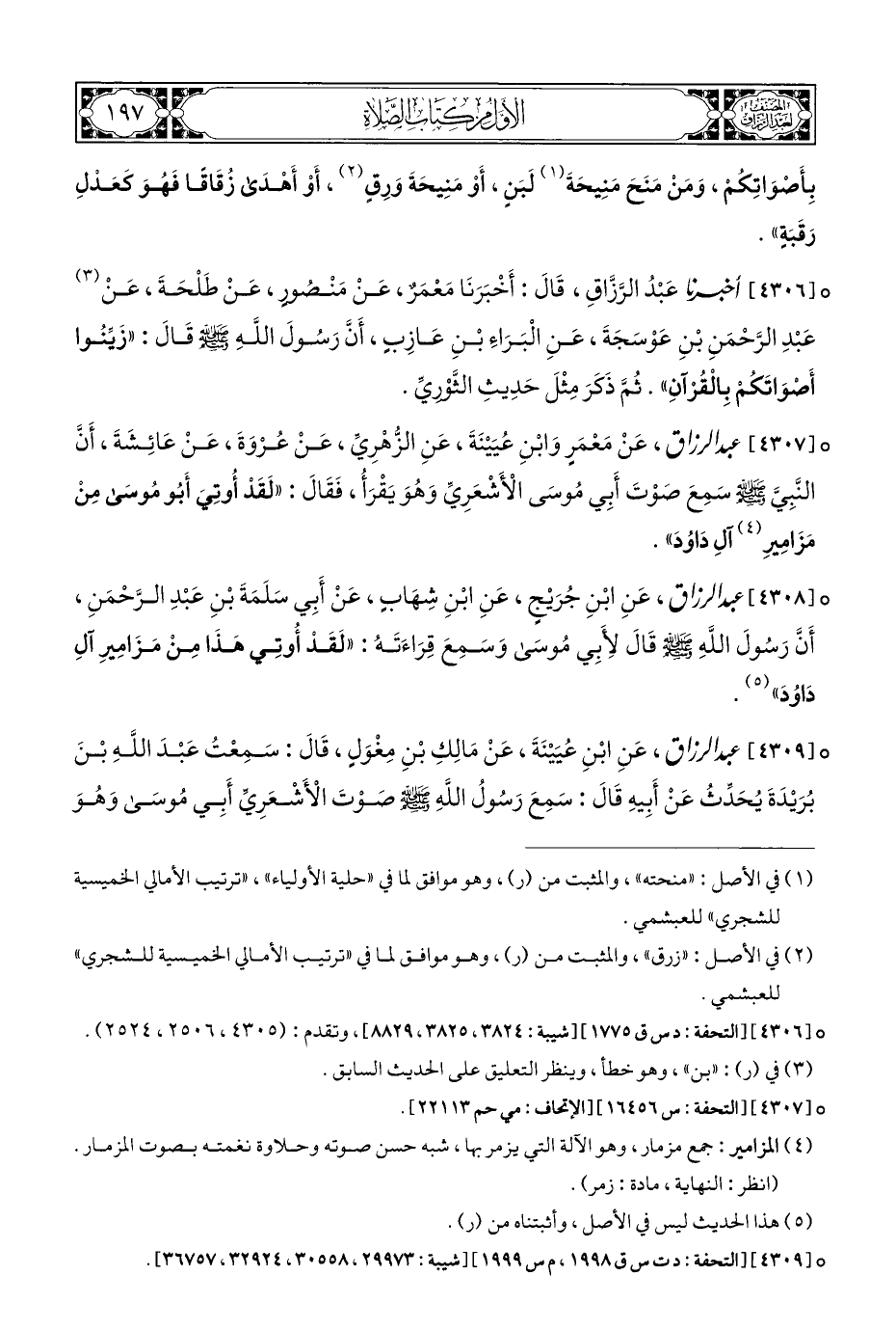 ° [٤٣٠٨] عبد الرزاق، عَنِ ابْنِ جُرَيْجٍ، عَنِ ابْنِ شِهَابٍ، عَنْ أَبِي سَلَمَةَ بْنِ عَبْدِ الرَّحْمَنِ، أَنَّ رَسُولَ الله - صلى الله عليه وسلم - قَالَ لِأَبِي مُوسَى وَسَمِعَ قِرَاءَتَهُ: "لَقَدْ أُوتِي هَذَا مِنْ مَزَامِيرِ آلِ دَاوُدَ" (¬٥).
