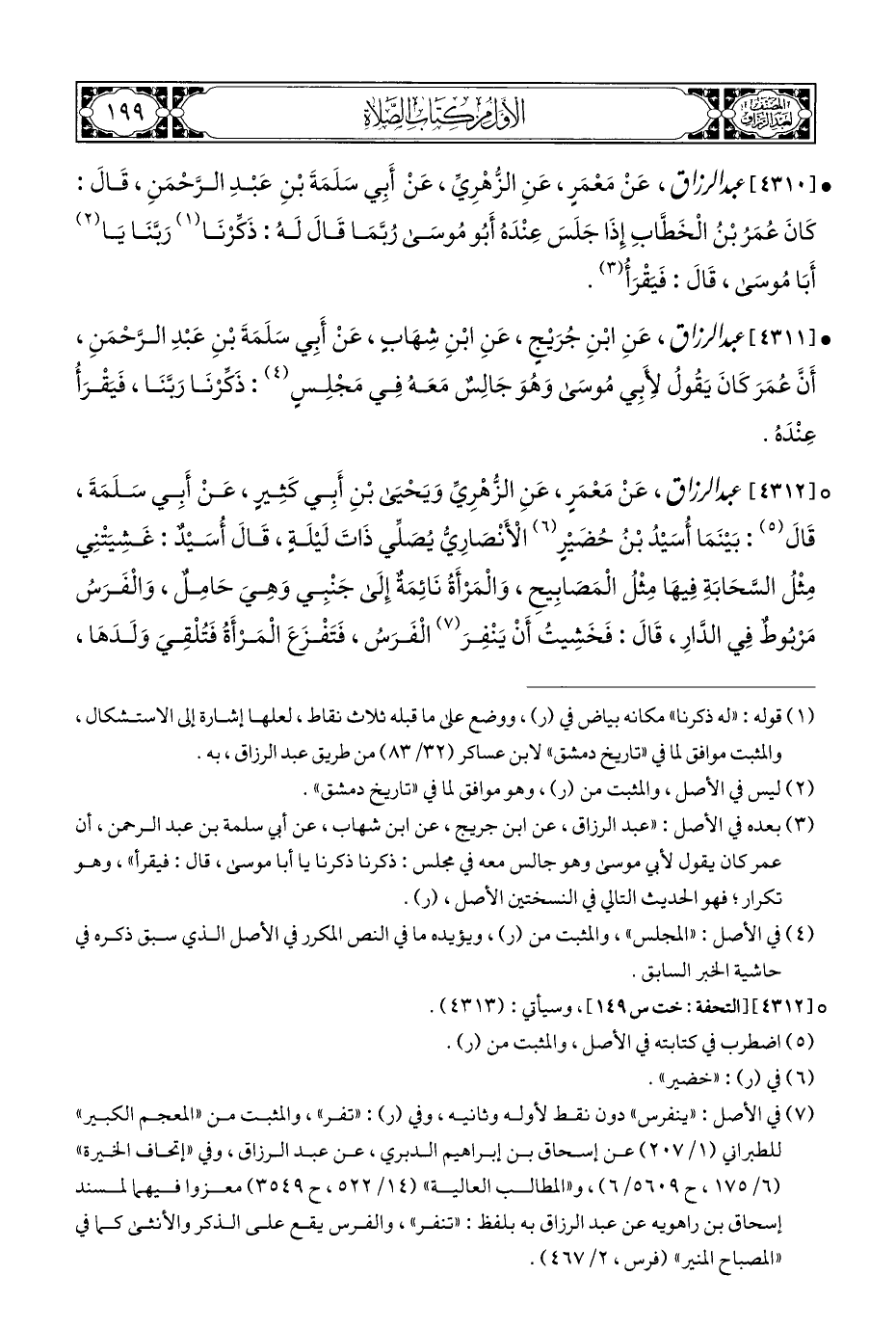 (¬٣) بعده في الأصل: "عبد الرزاق، عن ابن جريج، عن ابن شهاب، عن أبي سلمة بن عبد الرحمن، أن عمر كان يقول لأبي موسى وهو جالس معه في مجلس: ذكرنا ذكرنا يا أبا موسى، قال: فيقرأ"، وهو تكرار؛ فهو الحديث التالي في النسختين الأصل، (ر).