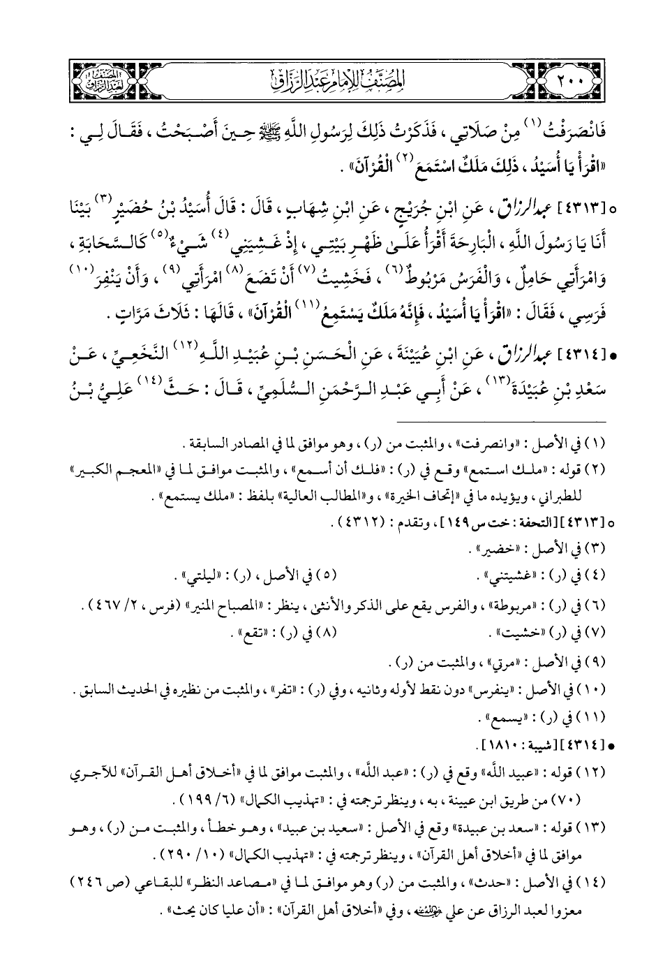 ° [٤٣١٣] عبد الرزاق، عَنِ ابْنِ جُرَيْجٍ، عَنِ ابْنِ شِهَابٍ، قَالَ: قَالَ أُسَيْدُ بْنُ حُضَيْرٍ (¬٣) بَيْنَا أَنَا يَا رَسُولَ اللَّهِ، الْبَارِحَةَ أَقْرَأُ عَلَى ظَهْرِ بَيْتِي، إِذْ غَشِيَنِي (¬٤) شَيءٌ (¬٥) كَالسَّحَابَةِ، وَامْرَأَتي حَامِلٌ، وَالْفَرَسُ مَرْبُوطٌ (¬٦)، فَخَشِيتُ (¬٧) أَنْ تَضَعَ (¬٨) امْرَأَتِي (¬٩)، وَأَنْ يَنْفِرَ (¬١٠) فَرَسِي، فَقَالَ: "اقْرَأْ يَا أُسَيْدُ، فَإِنَّهُ مَلَكٌ يَسْتَمِعُ (¬١١) الْقُرْآنَ"، قَالَهَا: ثَلَاثَ مَرَّاتٍ.
