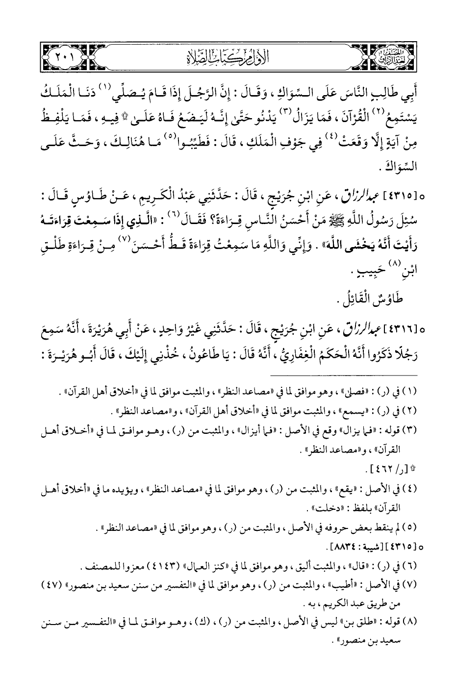 ° [٤٣١٥] عبد الرزاق، عَنِ ابْنِ جُرَيْجٍ، قَالَ: حَدَّثَنِي عَبْدُ الْكَرِيمِ، عَنْ طَاوُسٍ قَالَ: سُئِلَ رَسُولُ اللَّهِ - صلى الله عليه وسلم - مَنْ أَحْسَنُ النَّاسِ قِرَاءَةً؟ فَقَالَ (¬٦): "الَّذِي إِذَا سَمِعْتَ قِرَاءَتَهُ رَأَيْتَ أَنَّهُ يَخشَى اللَّهَ". وإِنِّي وَاللَّهِ مَا سَمِعْتُ قِرَاءَةَ قَطُّ أَحْسَنَ (¬٧) مِنْ قِرَاءَةِ طَلْقِ ابْنِ (¬٨) حَبِيبٍ.
