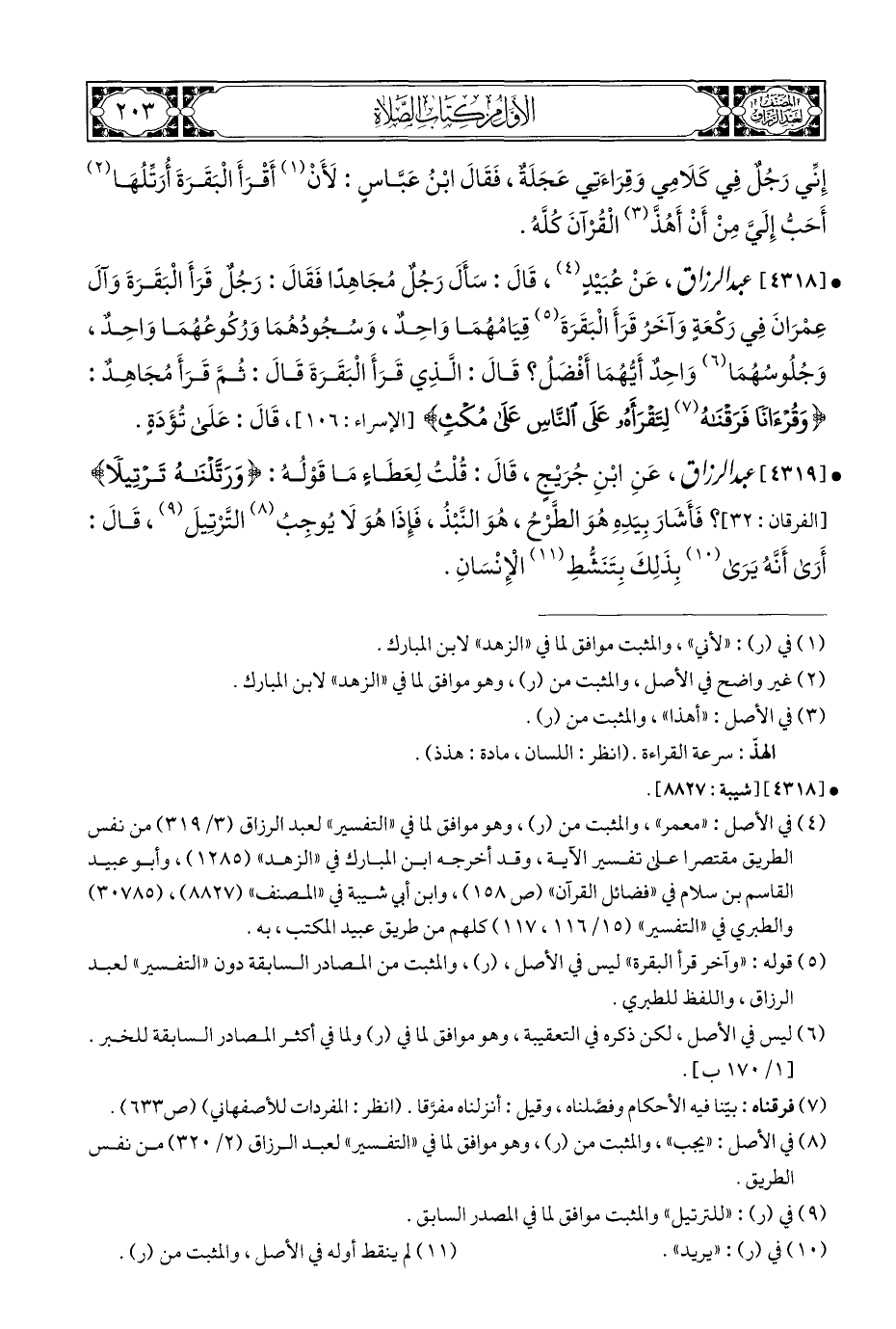 • [٤٣١٨] عبد الرزاق، عَنْ عُبَيْدٍ (¬٤)، قَالَ: سَأَلَ رَجُلٌ مُجَاهِدًا فَقَالَ: رَجُلٌ قَرَأَ الْبَقَرَةَ وَآلَ عِمْرَانَ فِي رَكْعَةٍ وَآخَرُ قَرَأَ الْبَقَرَةَ (¬٥) قِيَامُهُمَا وَاحِدٌ، وَسُجُودُهُمَا وَرُكُوعُهُمَا وَاحِدٌ، وَجُلُوسُهُمَا (¬٦) وَاحِد أَيُّهُمَا أَفْضَلُ؟ قَالَ: الَّذِي قَرَأَ الْبَقَرَةَ قَالَ: ثُمَّ قَرَأَ مُجَاهِدٌ: {وَقُرْآنًا فَرَقْنَاهُ (¬٧) لِتَقْرَأَهُ عَلَى النَّاسِ عَلَى مُكْثٍ} [الإسراء: ١٠٦]، قَالَ: عَلَى تُؤَدَةٍ.