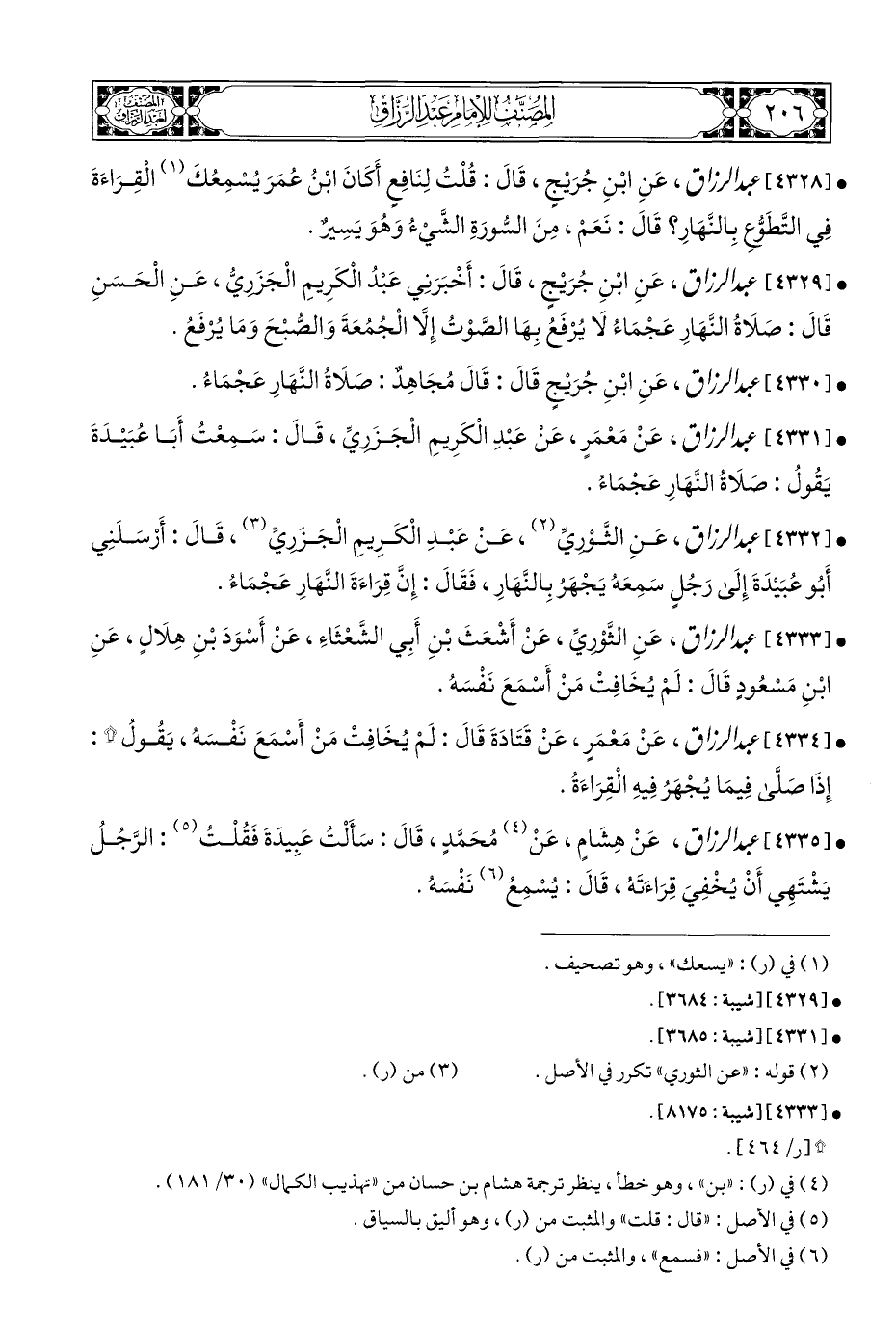 • [٤٣٣٢] عبد الرزاق، عَنِ الثَّوْرِيِّ (¬٢)، عَنْ عَبْدِ الْكَرِيمِ الْجَزَرِيِّ (¬٣)، قَالَ: أَرْسَلَنِي أَبُو عُبَيْدَةَ إِلَى رَجُلٍ سَمِعَهُ يَجْهَرُ بِالنَّهَارِ، فَقَالَ: إِنَّ قِرَاءَةَ النَّهَارِ عَجْمَاءُ.