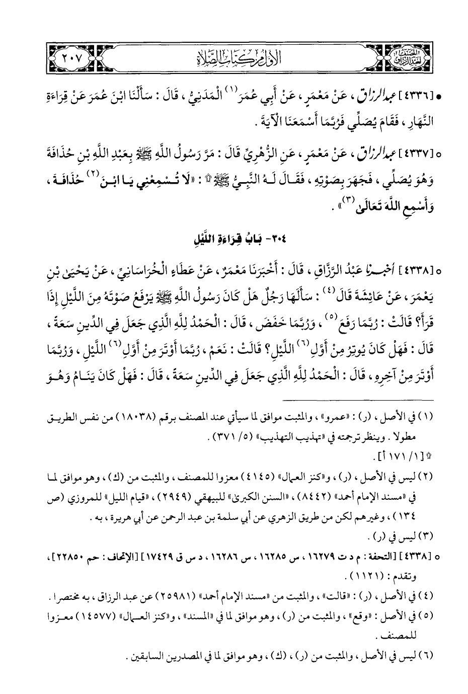 ° [٤٣٣٨] أخبرنا عَبْدُ الرَّزَّاقِ، قَالَ: أَخْبَرَنَا مَعْمَرٌ، عَنْ عَطَاءٍ الْخُرَاسَانِيِّ، عَنْ يَحْيَى بْنِ يَعْمَرَ، عَنْ عَائِشَةَ قَالَ (¬٤): سَأَلَهَا رَجُلٌ هَلْ كَانَ رَسُولُ اللَّهِ - صلى الله عليه وسلم - يَرْفَعُ صَوْتَهُ مِنَ اللَّيْلِ إِذَا قَرَأَ؟ قَالَتْ: رُبَّمَا رَفَعَ (¬٥)، وَرُبَّمَا خَفَضَ، قَالَ: الْحَمْدُ لِلَّهِ الَّذِي جَعَلَ فِي الدِّينِ سَعَةً، قَالَ: فَهَلْ كَانَ يُوتِرُ مِنْ أَوَّلِ (¬٦) اللَّيْلِ؟ قَالَتْ: نَعَمْ، رُبَّمَا أَوْتَرَ مِنْ أَوَّلِ (¬٦) اللَّيْلِ، وَرُبَّمَا أَوْتَرَ مِنْ آخِرِهِ، قَالَ: الْحَمْدُ لِلَّهِ الَّذِي جَعَلَ فِي الدِّينِ سَعَةً، قالَ: فَهَلْ كَانَ يَنَامُ وَهُوَ