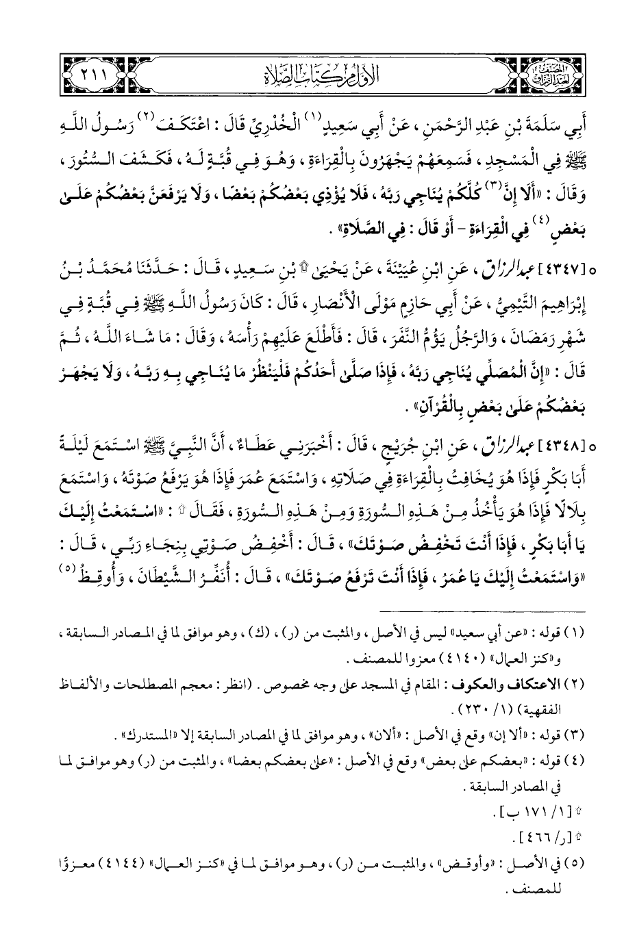 ° [٤٣٤٧] عبد الرزاق، عَنِ ابْنِ عُيَيْنَةَ، عَنْ يَحْيَى * بْنِ سَعِيدٍ، قَالَ: حَدَّثَنَا مُحَمَّدُ بْنُ إِبْرَاهِيمَ التَّيْمِيُّ، عَنْ أَبِي حَازِمٍ مَوْلَى الْأَنْصَارِ، قَالَ: كَانَ رَسُولُ اللَّهِ - صلى الله عليه وسلم - فِي قُبَّةٍ فِي شَهْرِ رَمَضَانَ، وَالرَّجُلُ يَؤُمُّ النَّفَرَ، قَالَ: فَأَطْلَعَ عَلَيْهِمْ رَأْسَهُ، وَقَالَ: مَا شَاءَ اللَّهُ، ثُمَّ قَالَ: "إِنَّ الْمُصَلِّي يُنَاجِي رَبَّهُ، فَإِذَا صَلَّى أَحَدُكُمْ فَلْيَنْظُرْ مَا يُنَاجي بِهِ رَبَّهُ، وَلَا يَجهَرْ بَعْضُكُمْ عَلَى بَعْضٍ بِالْقُرْآنِ".
