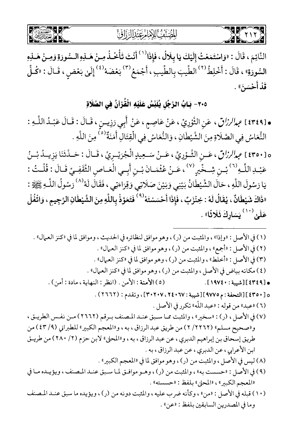 ° [٤٣٥٠] عبد الرزاق، عَنِ الثَّوْريِّ، عَنْ سَعِيدٍ الْجُرَيْرِيِّ، قَالَ: حَدَّثَنَا يَزِيدُ بْنُ عَبْدِ اللَّهِ (¬٦) بْنِ شِخِّيرٍ (¬٧)، عَنْ عُثْمَانَ بْنِ أَبِي الْعَاصِ الثَّقَفِي قَالَ: قُلْتُ: يَا رَسُولَ اللَّهِ، حَالَ الشَّيْطَانُ بَيْنِي وَبَيْنَ صَلَاتِي وَقِرَاءَتِي، فَقَالَ لَهُ (¬٨) رَسُولُ اللَّهِ - صلى الله عليه وسلم -: "ذَاكَ شَيْطَانٌ، يُقَالُ لَهُ: خِنْزَبٌ، فَإِذَا أَحْسَسْتَهُ (¬٩) فَتَعَوَّذْ بِاللَّهِ مِنَ الشَّيْطَانِ الرَّجِيمِ، وَاتفُل عَلَى (¬١٠) يَسَارِكَ ثَلَاثًا".