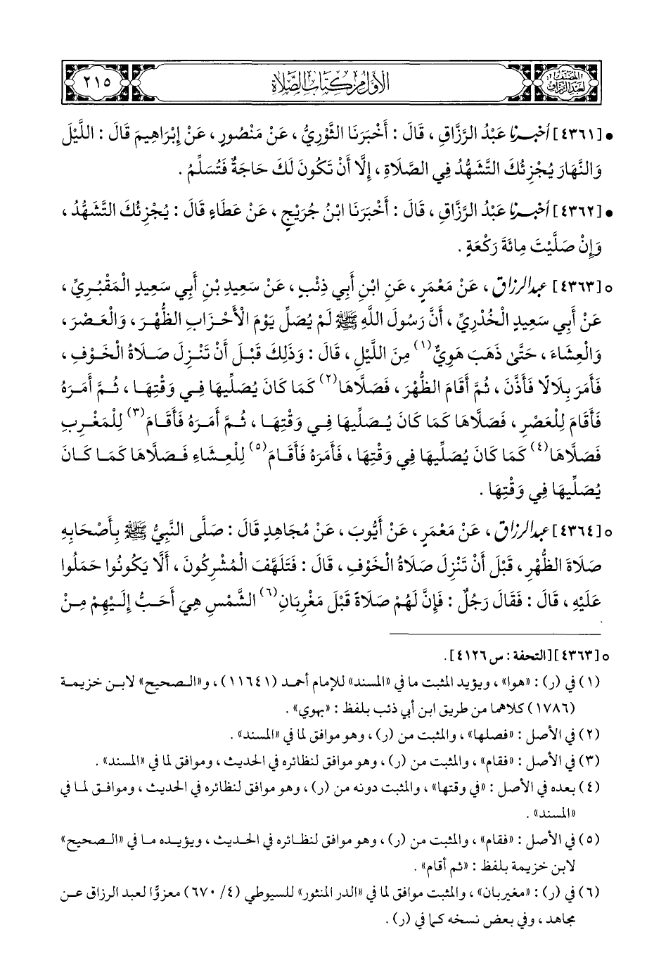 ° [٤٣٦٤] عبد الرزاق، عَنْ مَعْمَرٍ، عَنْ أَيُّوبَ، عَنْ مُجَاهِدٍ قَالَ: صَلَّى النَّبِيُّ - صلى الله عليه وسلم - بِأَصْحَابِهِ صَلَاةَ الظُّهْرِ، قَبْلَ أَنْ تَنْزِلَ صَلَاةُ الْخَوْفِ، قَالَ: فَتَلَهَّفَ الْمُشْرِكُونَ، أَلَّا يَكُونُوا حَمَلُوا عَلَيْهِ، قَالَ: فَقَالَ رَجُلٌ: فَإِنَّ لَهُمْ صَلَاةَ قَبْلَ مَغْرِبَانِ (¬٦) الشَّمْسِ هِيَ أَحَبُّ إِلَيْهِمْ مِنْ