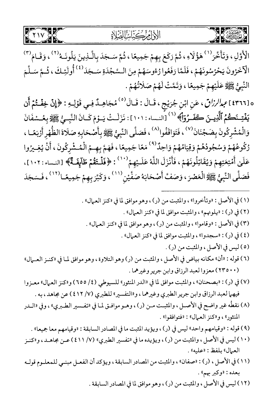 ° [٤٣٦٦] عبد الرزاق، عَنِ ابْنِ جُرَيْجٍ، قَالَ: قَالَ (¬٥) مُجَاهِدٌ فِي قَوْلِهِ: {إِنْ خِفْتُمْ أَنْ يَفْتِنَكُمُ الَّذِينَ كَفَرُوا} (¬٦) [النساء: ١٠١]: نَزَلَتْ يَوْمَ كَانَ النَّبِيُّ - صلى الله عليه وسلم - بِعُسْفَانَ وَالْمُشْرِكُونَ بِضَجْنَانَ (¬٧)، فَتَوَاقَفُوا (¬٨)، فَصَلَّى النَّبِيُّ - صلى الله عليه وسلم - بأَصْحَابِهِ صَلَاةَ الظُّهْرِ أَرْبَعًا، رُكُوعُهُمْ وَسُجُودُهُمْ وَقِيَامُهُمْ وَاحِدٌ (¬٩) مَعًا جَمِيعًا، فَهَمَّ بِهِمُ الْمُشْرِكُونَ، أَنْ يُغِيرُوا عَلَى أَمْتِعَتِهِمْ وَيُقَاتِلُونَهُمْ، فَأَنْزَلَ اللَّهُ عَلَيْهِمْ (¬١٠): {فَلْتَقُمْ طَائِفَةٌ} [النساء: ١٠٢]، فَصَلَّى النَّبِي - صلى الله عليه وسلم - الْعَصْرَ، وَصَفَّ أَصْحَابَهُ صَفَّيْنِ (¬١١)، وَكَبَّرَ بِهِمْ جَمِيعًا (¬١٢)، فَسَجَدَ
