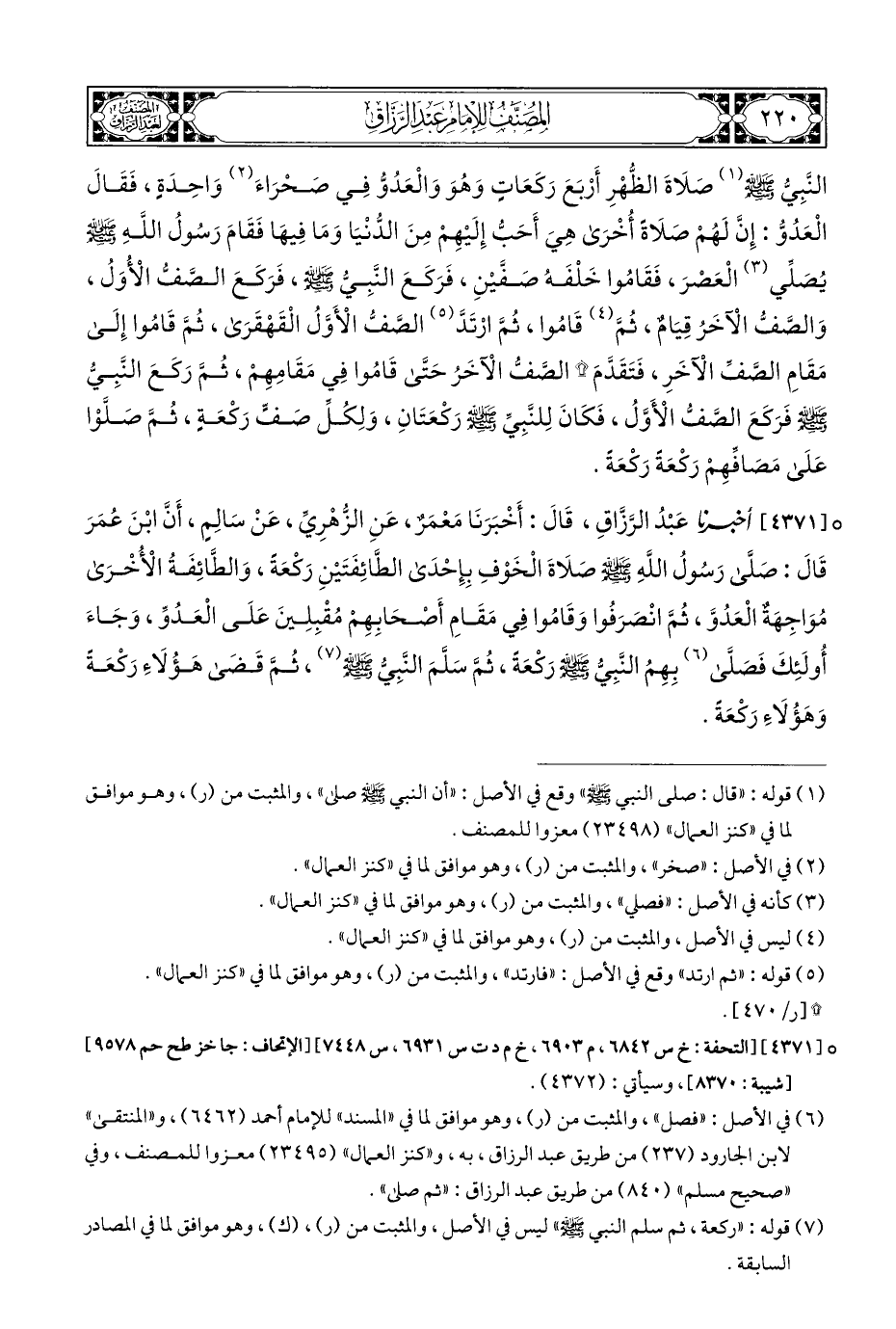 ° [٤٣٧١] أخبرنا عَبْدُ الرَّزَّاقِ، قَالَ: أَخْبَرَنَا مَعْمَرٌ، عَنِ الزُّهْرِيِّ، عَنْ سَالِمٍ، أَنَّ ابْنَ عُمَرَ قَالَ: صَلَّى رَسُولُ اللَّهِ - صلى الله عليه وسلم - صلَاةَ الْخَوْفِ بِإِحْدَى الطَّائِفَتَيْنِ رَكْعَةً، وَالطَّائِفَةُ الْأُخْرَى مُوَاجِهَةٌ الْعَدُوَّ، ثُمَّ انْصَرَفُوا وَقَامُوا فِي مَقَامِ أَصْحَابِهِمْ مُقْبِلِينَ عَلَى الْعَدُوِّ، وَجَاءَ أُولَئِكَ فَصلَّى (¬٦) بِهِمُ النَّبِي - صلى الله عليه وسلم - رَكْعَةً، ثُمَّ سَلُّمَ النَّبِيُّ - صلى الله عليه وسلم - (¬٧)، ثُمَّ قَضَى هَؤُلَاءِ رَكْعَةً وَهَؤُلَاءَ رَكْعَةً.